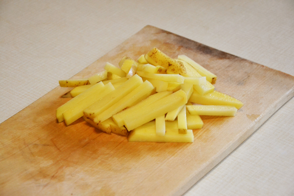 Далее картошка. Для хардкорщиков пояснять ничего не буду, просто сделайте фри. Температура масла должна быть такая, что когда забрасываешь деревянную шпажку в масло, она начинает шипеть. И да, вытрите картоху насухо! А вот для фитоняшек отдельный рецепт. Я недавно взвесился и с приятным удивление обнаружил, что скинул 10 кг (Просто жена на дачу уехала), так что рисковать своей божественной фигурой я не хотел и начал гуглить, как приготовить картошку фри без, собственно, фри. Нашел один интересный рецепт. Картоху режем на брусочки, я ее не чищу, мне со шкуркой больше нравится.