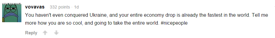 Ну и не обошлось без свидомого бреда: Перевод:Вы даже не завоевали Украину, и ваша экономика падает быстрее всех в мире. Рассказывайте больше, как вы такие крутые захватывайте весь мир #nicepeople
