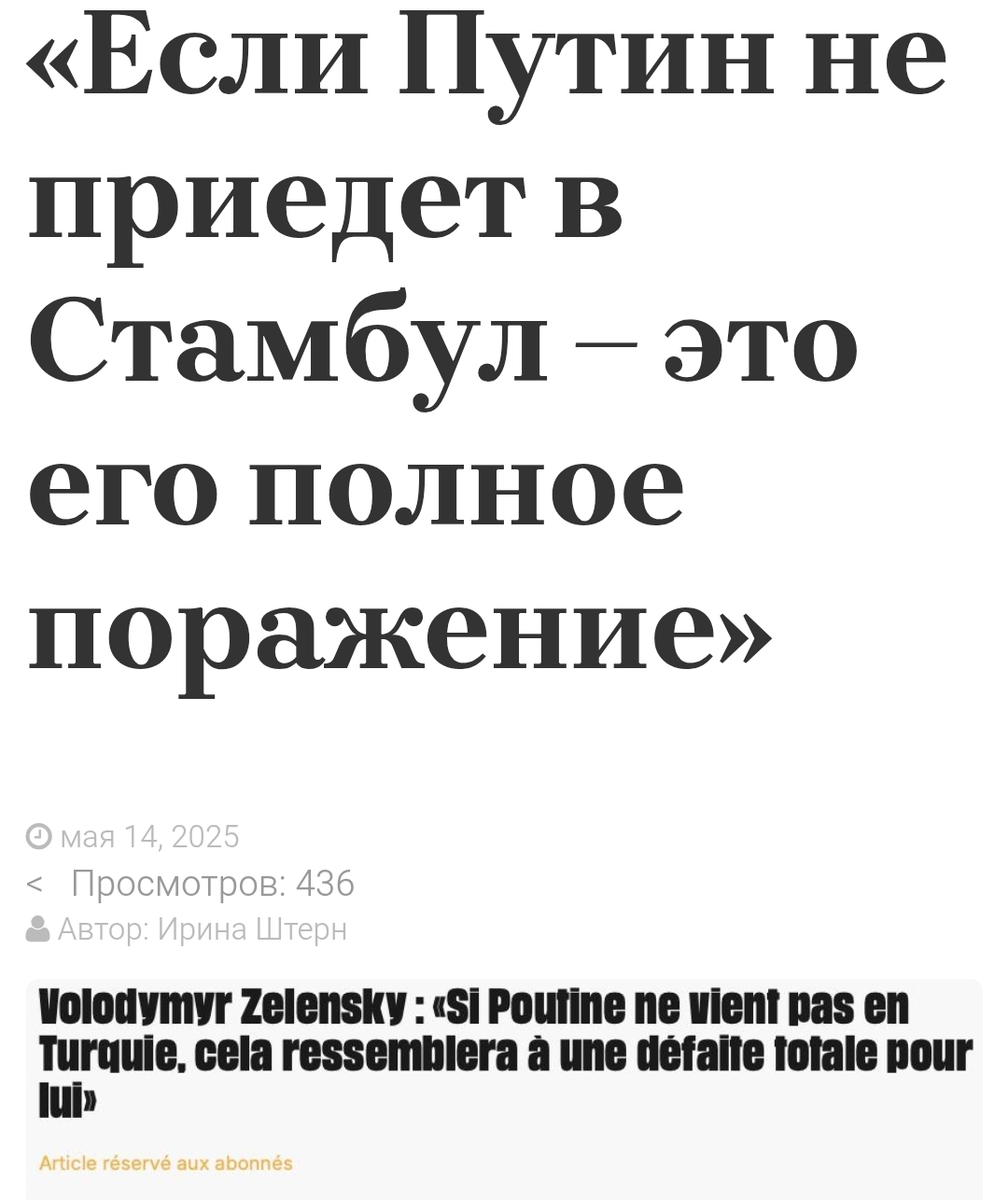 Я думал , что главная новость нынче прямые мирные переговоры в Стамбуле, и какой-то там мир в целом, несмотря на то, что все кладут большой болт на него? Ошибся! ЕС сейчас интересует приедет ли на стамбульский цирк Путин или он впанике (УНИАН на ютуб отдельная песня), обсасывают со всех сторон. Особенно радует в этом плане Зеленский и украинская пропаганда (Ссылка 1, ссылка 2, Ссылка 3). Мемы, сми, соцсети пестрят колкостями. Порой кажется, что Кремль специально создал ситуацию с прямыми переговорами, чтобы посмотреть, как будет корёжить мировую проукраинскую камарилью.