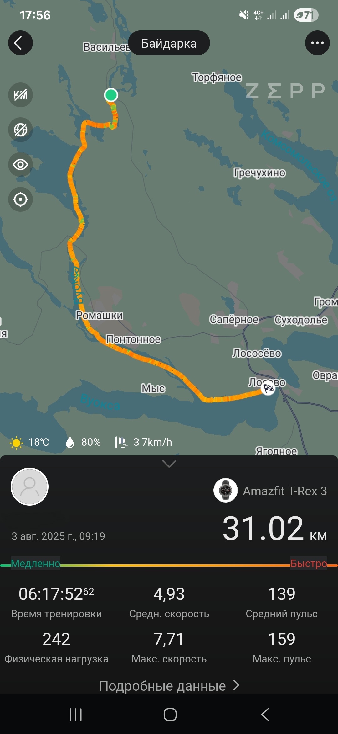 Средняя скорость, конечно, так себе, на Петровский гребной марафон рановато, но будем пробовать дальше)