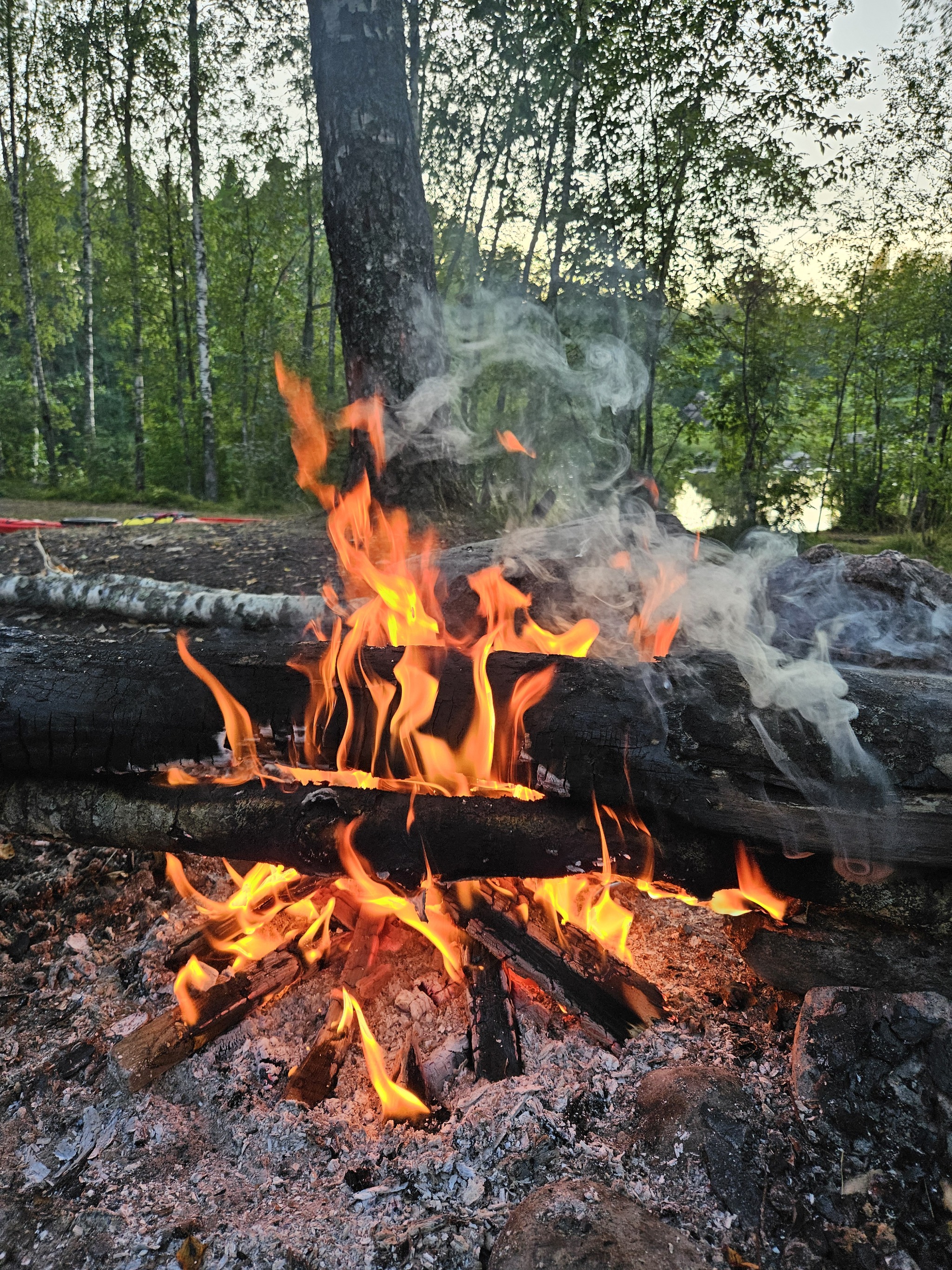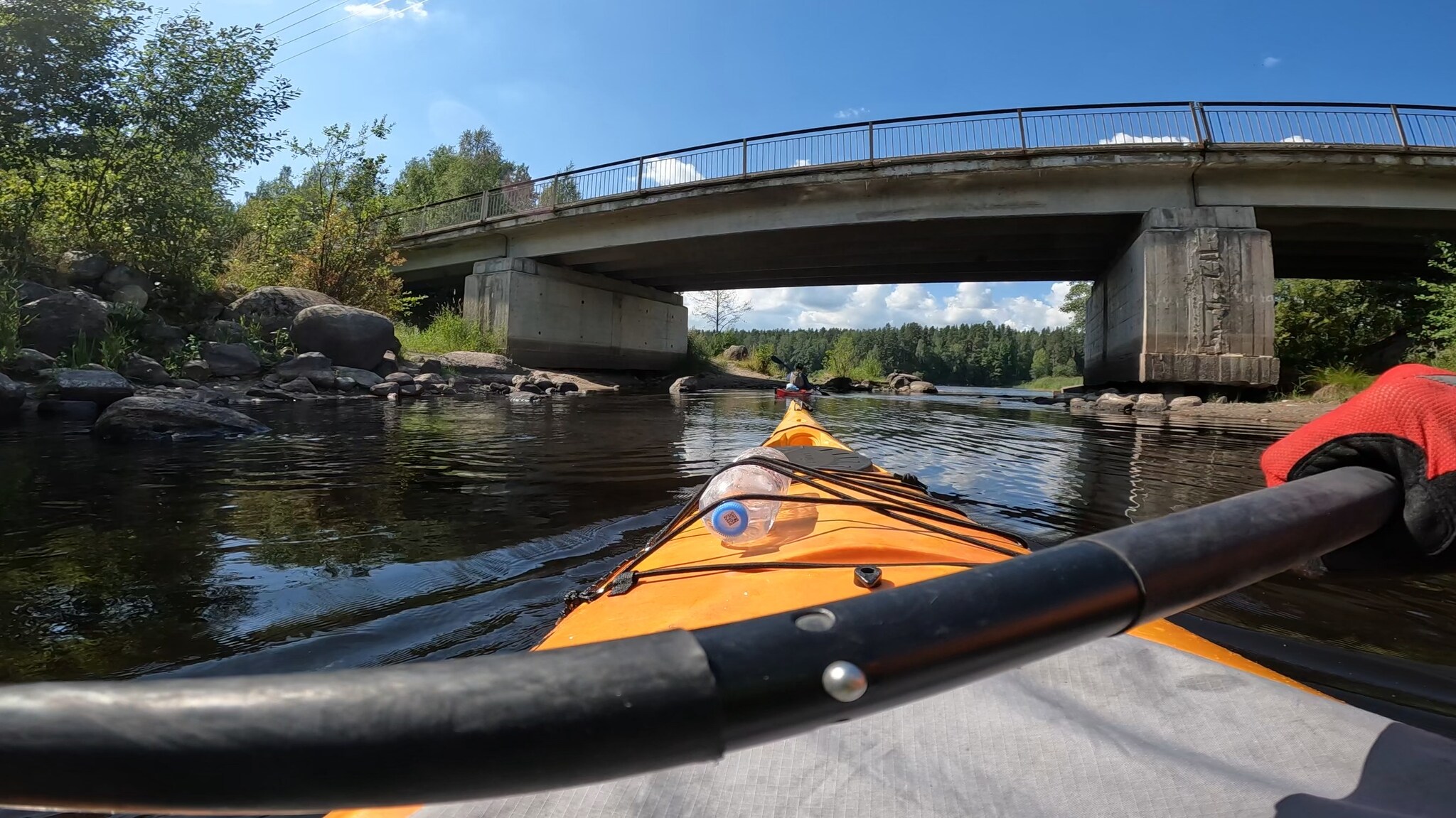 Прибыли в Мельниково, загрузили каяки и стартанули что-то около четырех вечера. Фоток в первый день практически не делал, увы, есть только кадры с камеры. Так как плыли против течения, порог пришлось обходить по берегу.