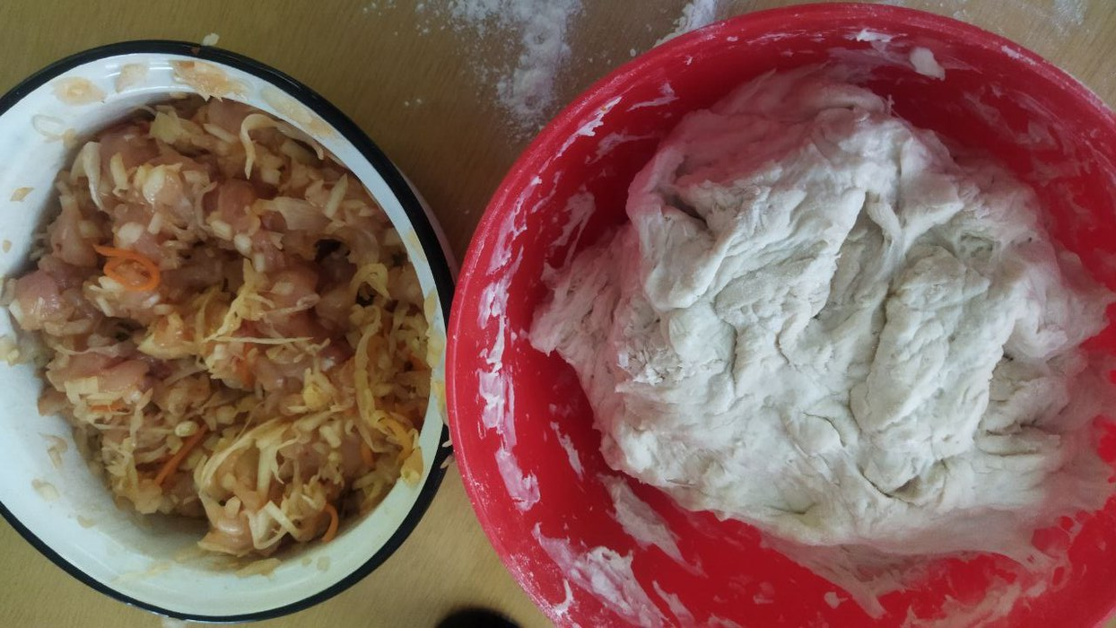Мелко нарезать филе курицы, добавить нашинкованный лук, специи и квашенную капусту (если крупная, то мелко порезать).