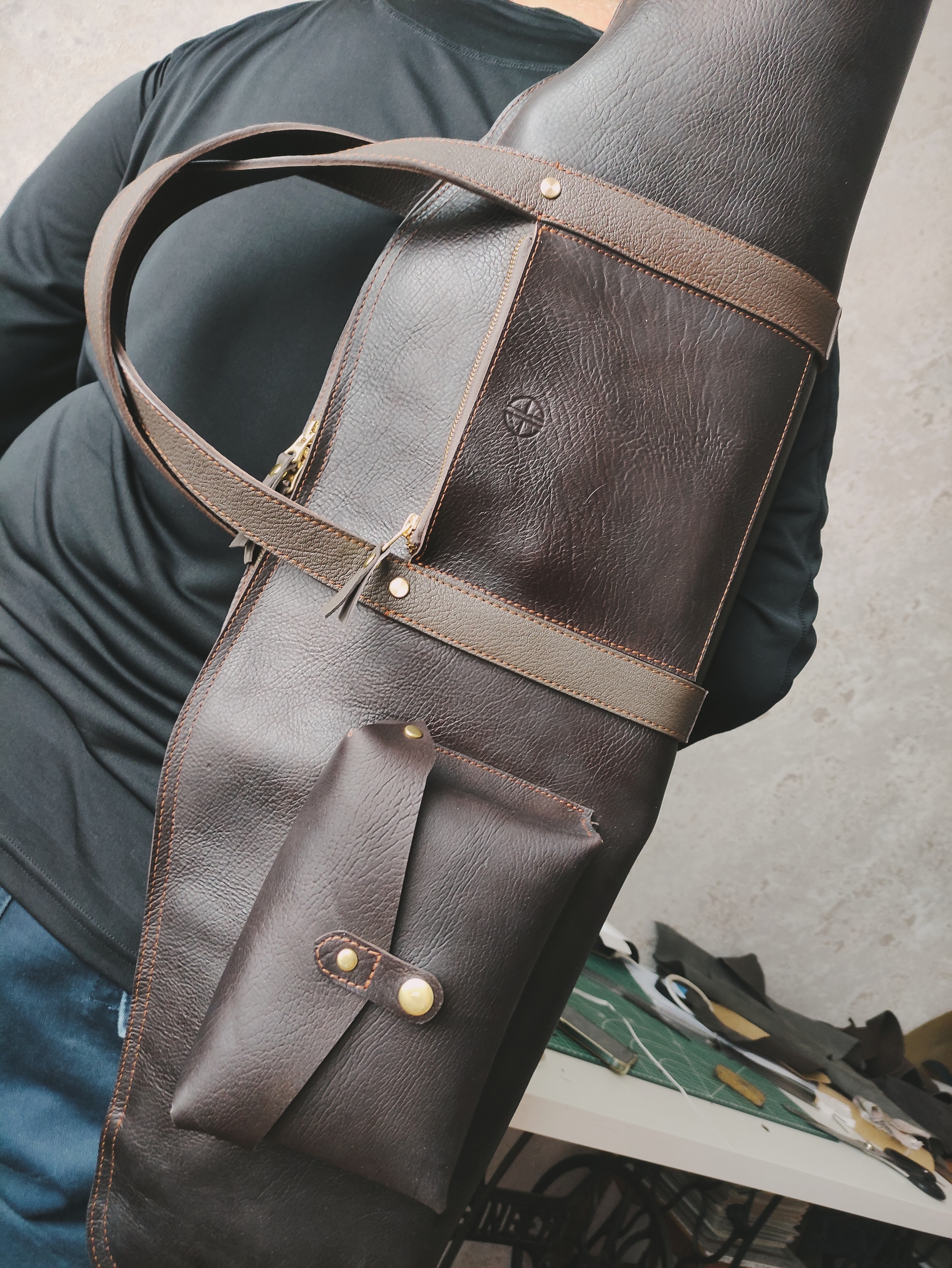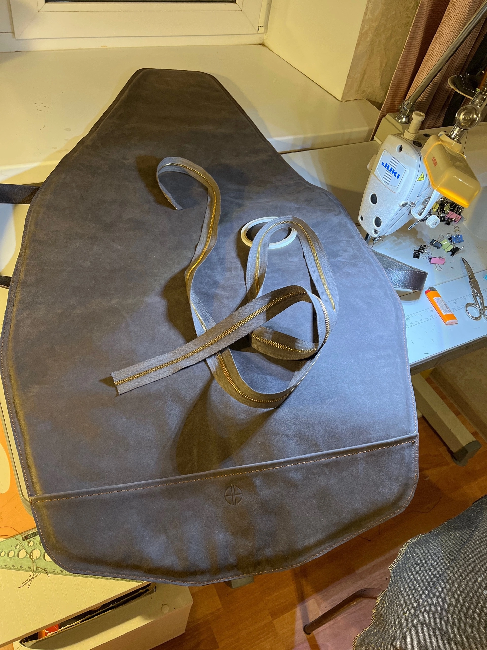 Была куплена толстая кожа КРС, к ней подобрана серо-коричневая кожа козы, а на подклад взят нубук. Фурнитура латунная, не вся на фото, в процессе были докуплены винты и прочее... Молния и бегунки YKK, нитки Gutermann.
