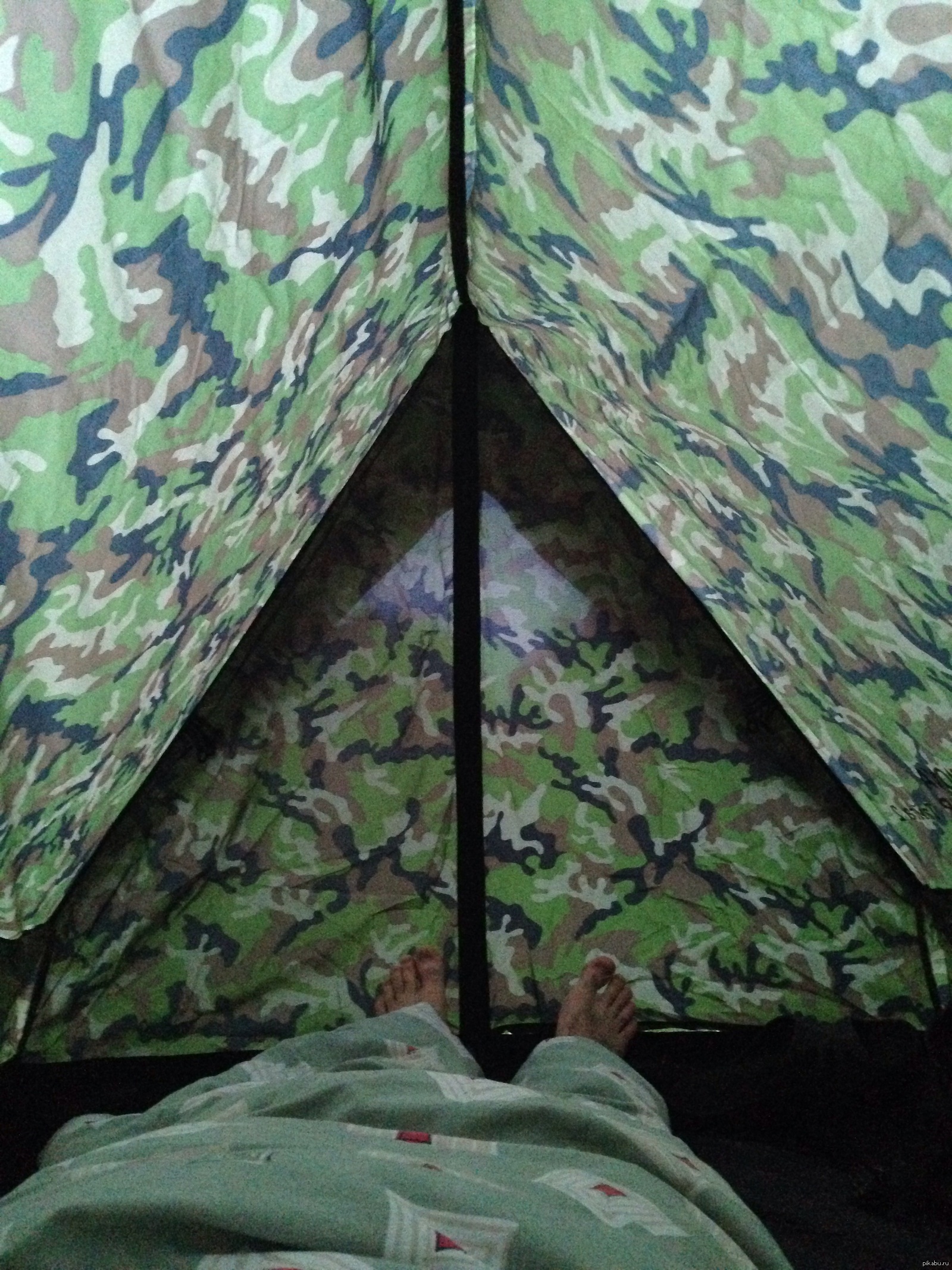 Тупо лежу в палатке на даче в заМКАДье. Спальник забыл в городе, вместо него подушка и одеяло. Рядом стоит нормальный, а мне и так хорошо.