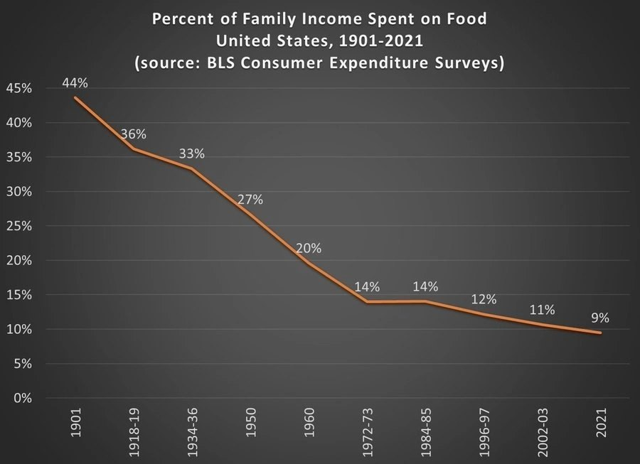 На графике - процент семейных доходов, который американские домохозяйства тратили на еду за последние 120 лет.