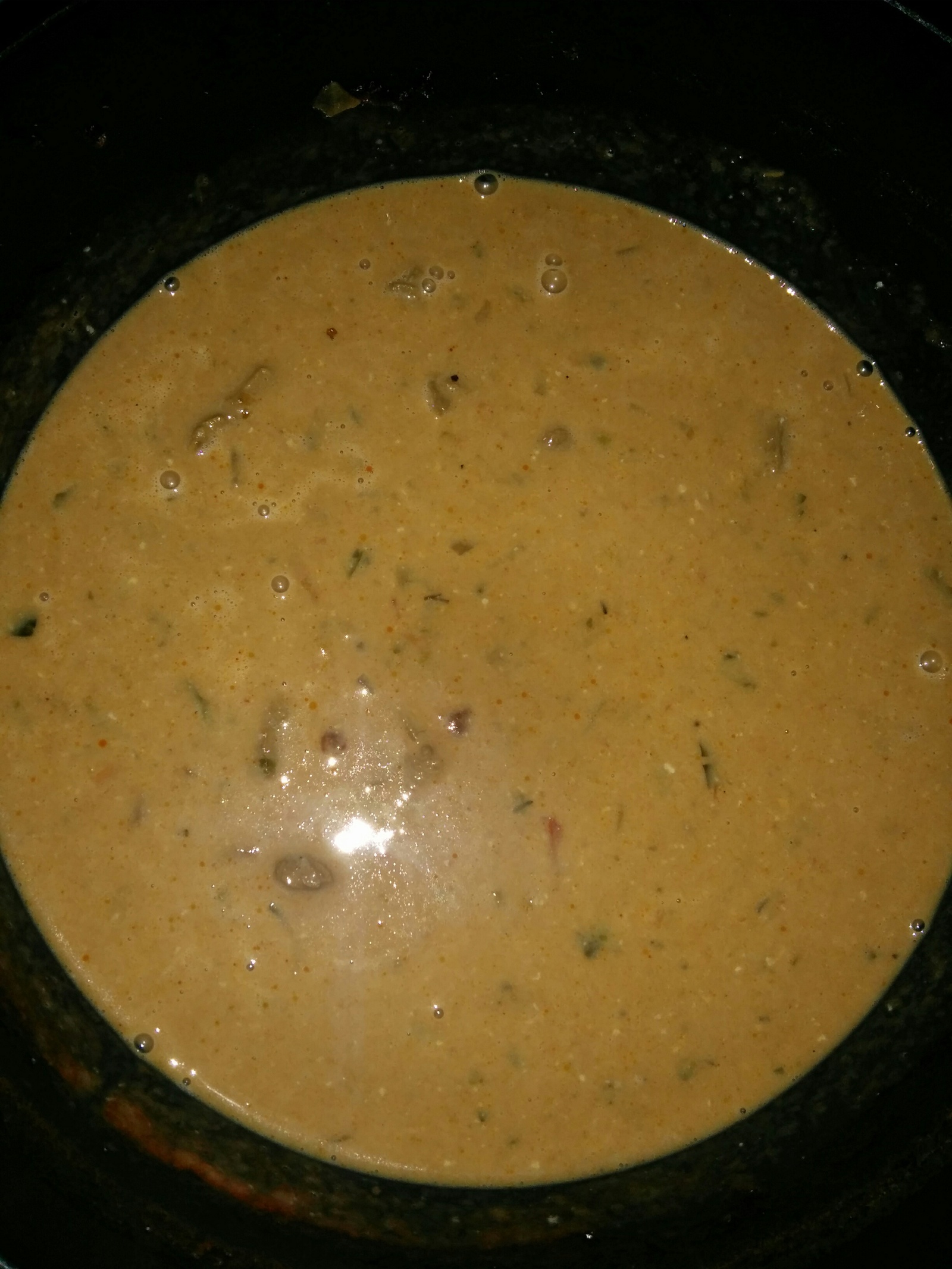 В миске взбиваем сливки с желтками. Добавляем половник уварившейся жидкости и перемешиваем до полного смешивания. В казан возвращаем мясо и вливаем смесь. Тушим на среднем огне ещё 4-5 минуты до загустения соуса.