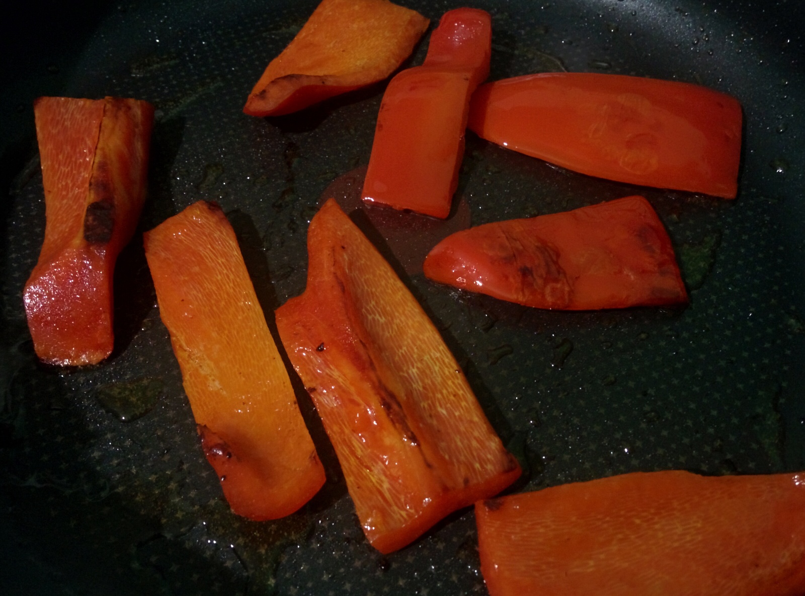 Болгарский перец нарезаем полосками шириной 1,5-2,5 см. и обжариваем с двух сторона по 2-3 минуты.