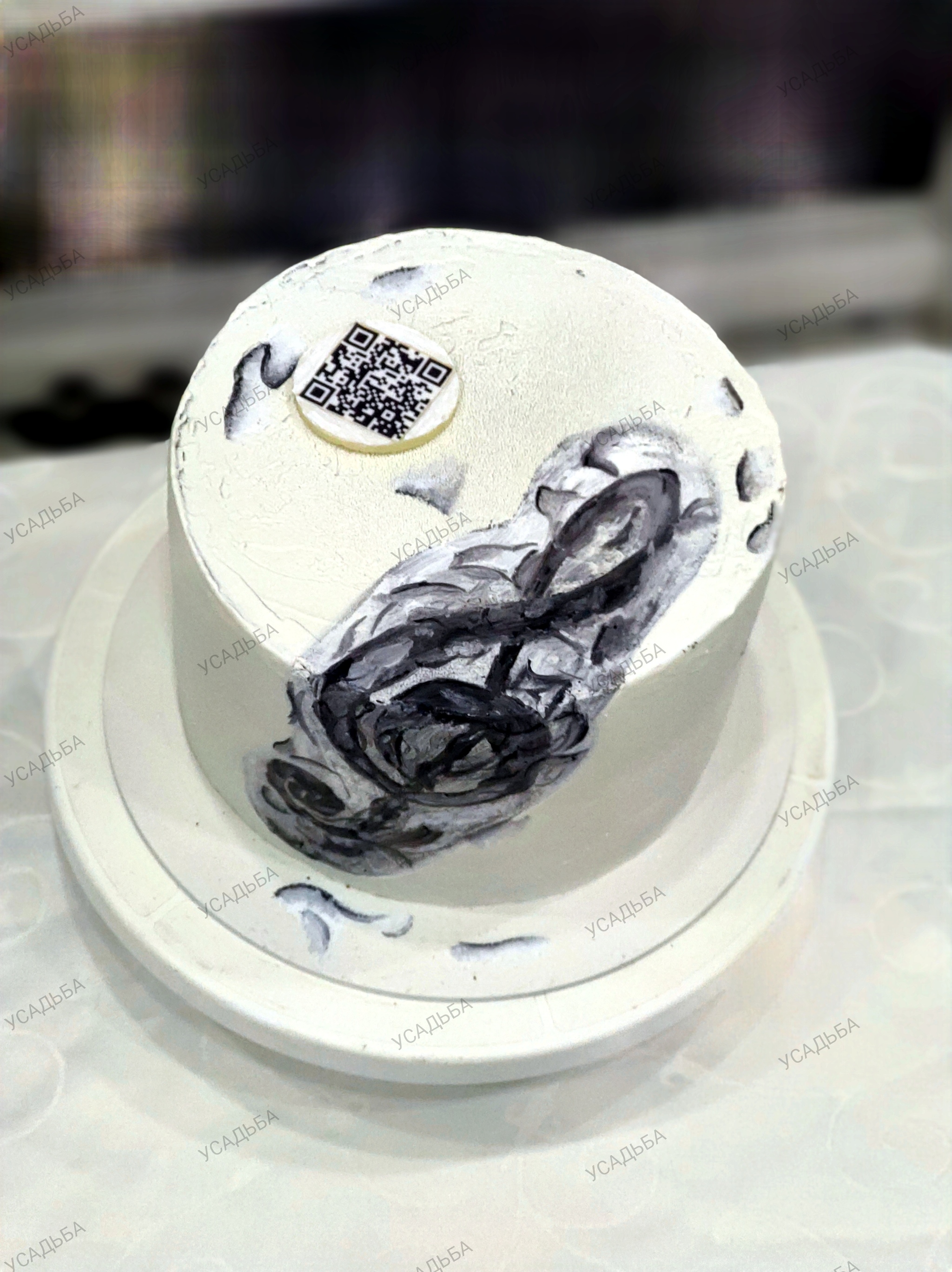 Декор: рисунок на шоколадном ганаше ( обведен по контуру велюром), qr-код: съедобная печать на белом шоколаде. Qr-код ведёт на клип любимой группы заказчика.