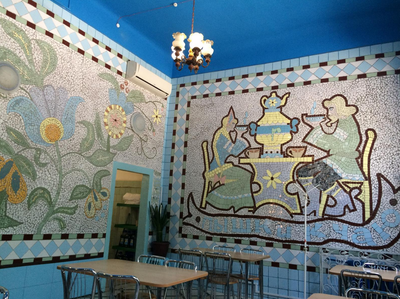 На стене мозаикой выложен рисунок: мужчина и женщина пьют чай. Я любила разглядывать его пока мы кушали.