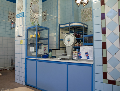 Вы не представляете!! Все как прежде!! Та же стойка, за которой стоит женщина-продавец в белом халате и фартуке и с колпаком на голове.