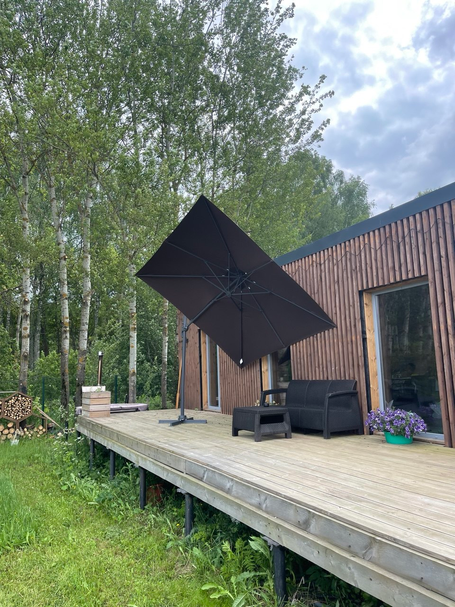Ветер поднялся на столько, что зонт выгнуло, стойку погнуло, и крепеж к террасе тоже выгнуло. Оказалось, что всё не так уж и радужно.