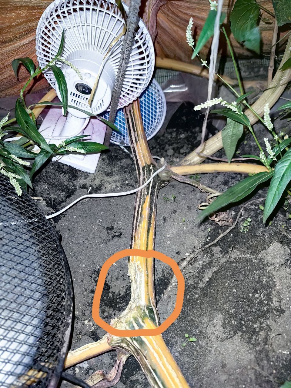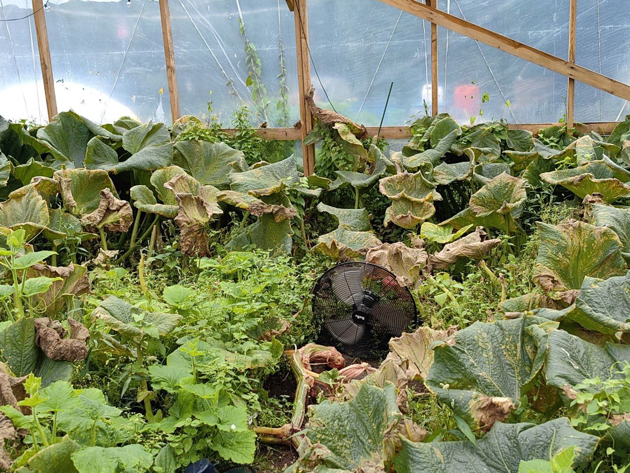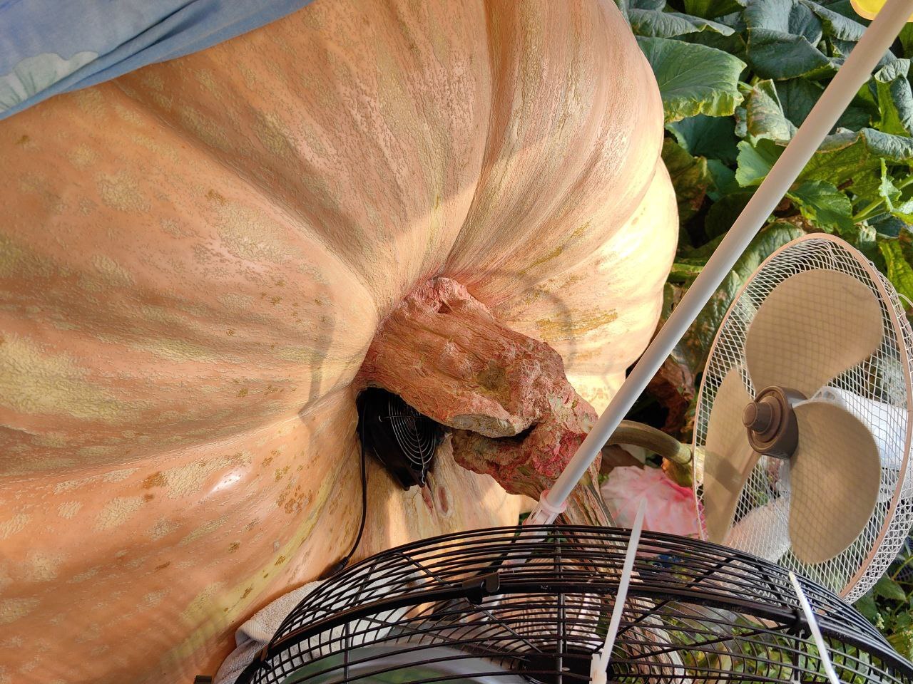 Плодоножка Вульфа — это, конечно, отдельный хардкор. Не так давно я обнаружил, что она снова стала гнить. Дело в том, что верхняя стенка плодоножки изнутри не особо проветривалась, так как поток воздуха задувается сбоку. По итогу мне пришлось отрезать солидный кусок, и я уже начал думать, что мне придется срезать тыкву с куста раньше времени. Но тут мне пришла в голову идея установить кулер для компьютера прямо в тыкву, чтобы он перенаправлял поток воздуха в труднодоступную зону. На данный момент ситуация стабилизирована.