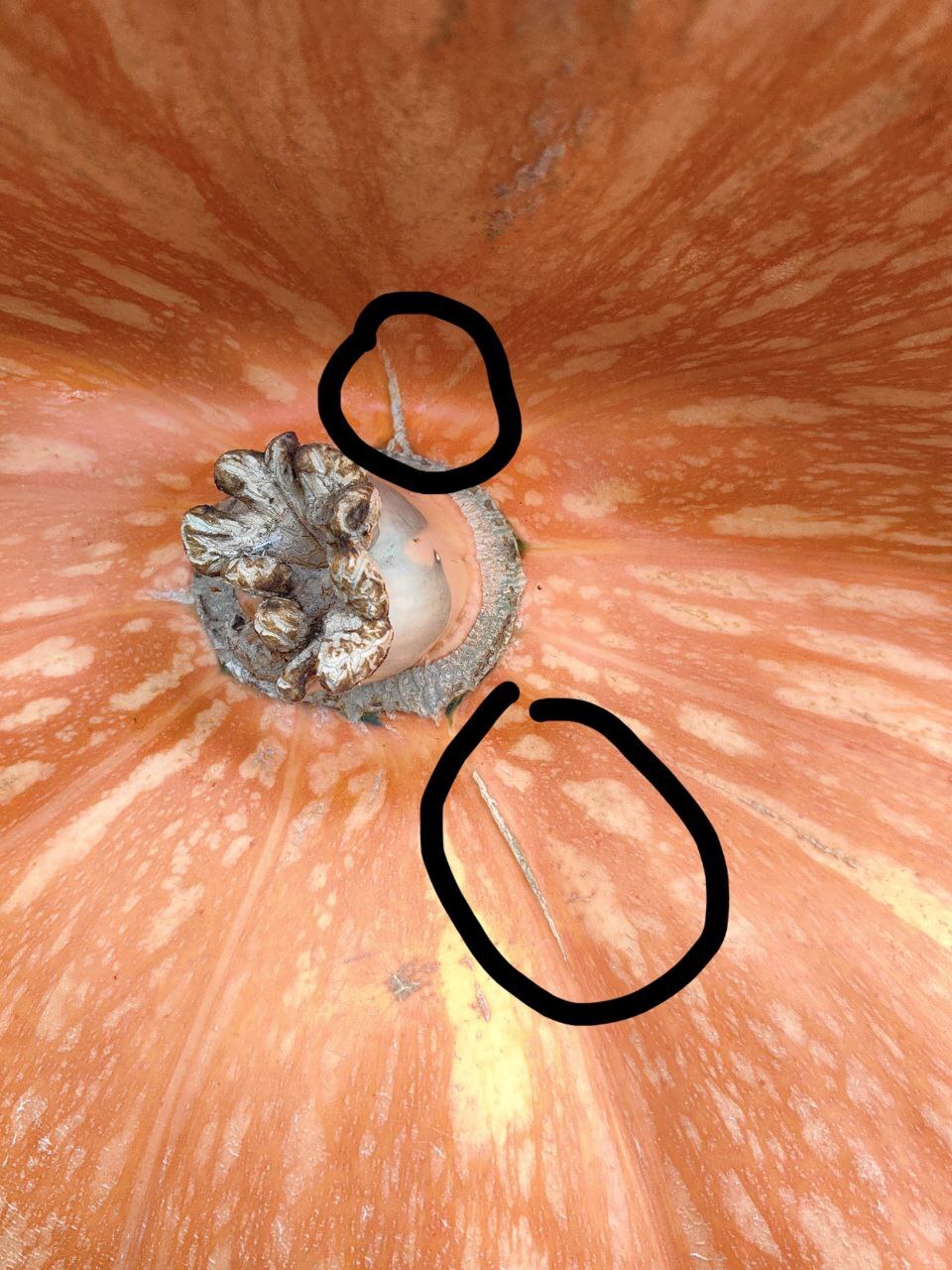 Но это ерунда, ничего страшного. Но вот трещины рядом с пестиком заставили меня поволноваться, ведь именно в этой части тыквы лопаются. Но пока всё в порядке.