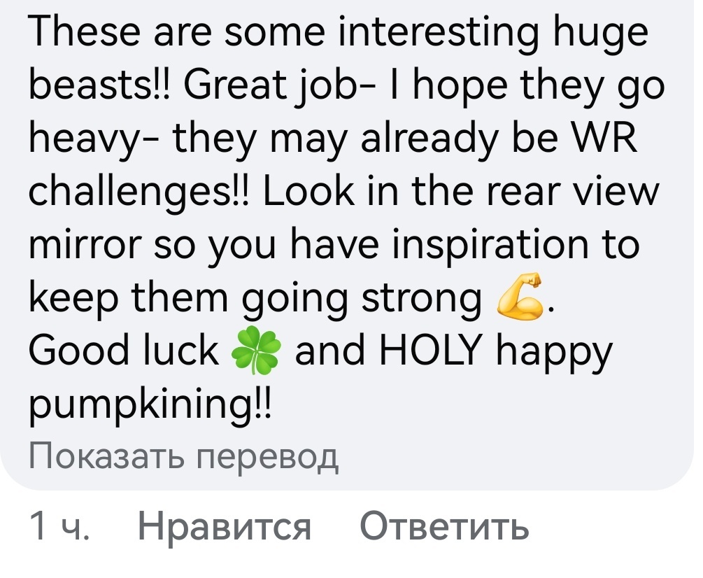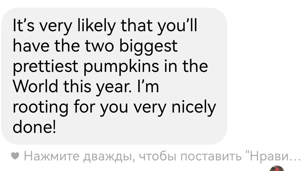 Сейчас я отчетливо понимаю, что мои тыквы находятся в числе потенциальных лидеров. Как я когда-то писал, если тыква будет весить больше 1000 кг, то это обеспечит позицию на верхних строках чарта. В прошлом году было примерно 30 тыкв, которые весили больше тонны. Это замечаю не только я, но и зарубежные коллеги. Все больше и больше мне приходит сообщений с теплыми пожеланиями.
