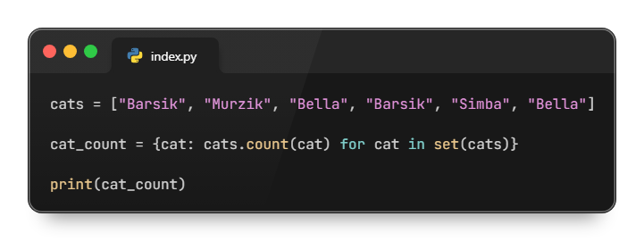 Здесь мы используем словарь и set comprehension, чтобы подсчитать количество каждого кота.