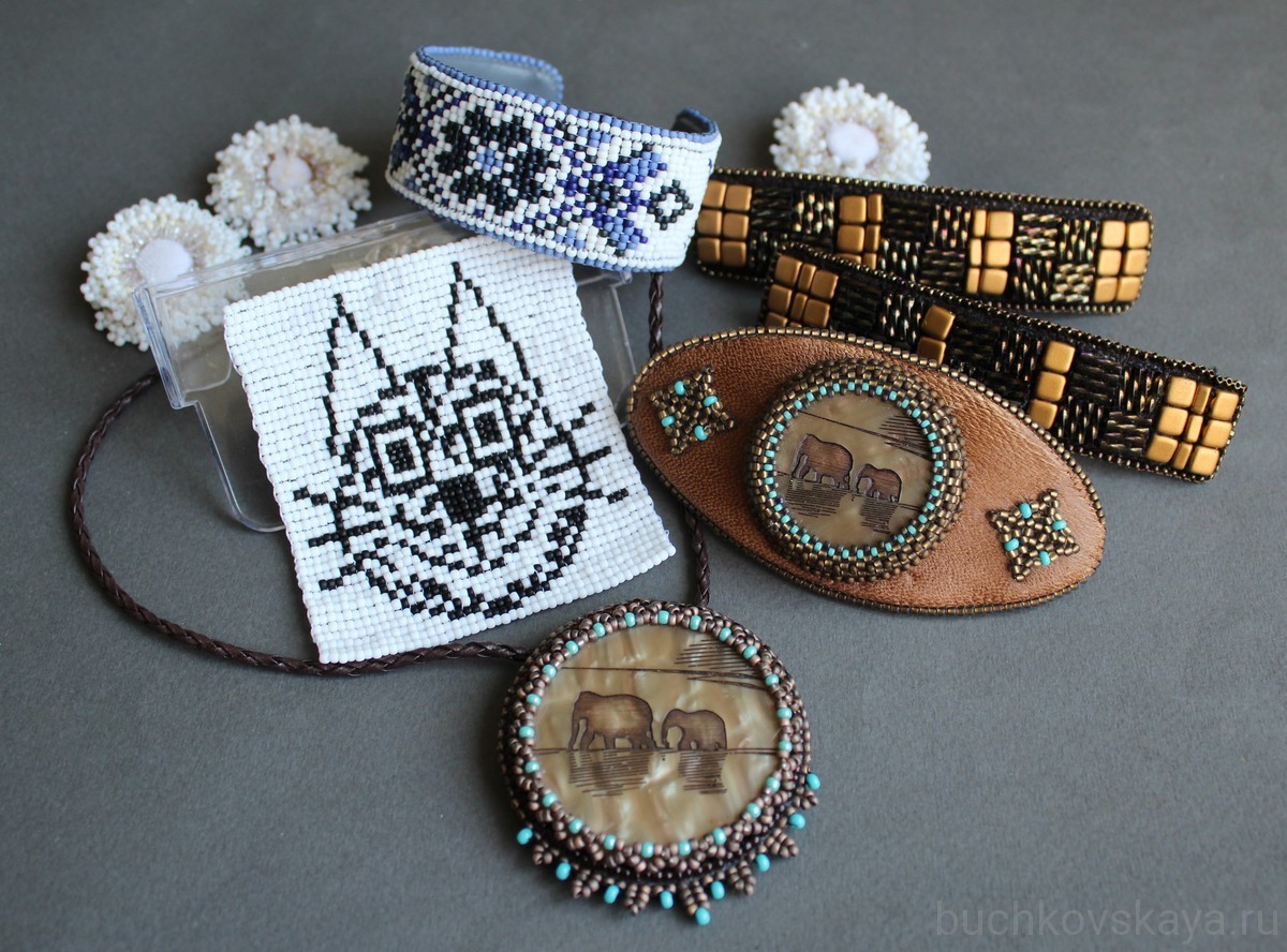 Вот сфотографировала для сравнения работы из бисера разных размеров: QR-кот и браслет - 11-й ТОНО, брошки-цветочки - 15-й ТОНО.