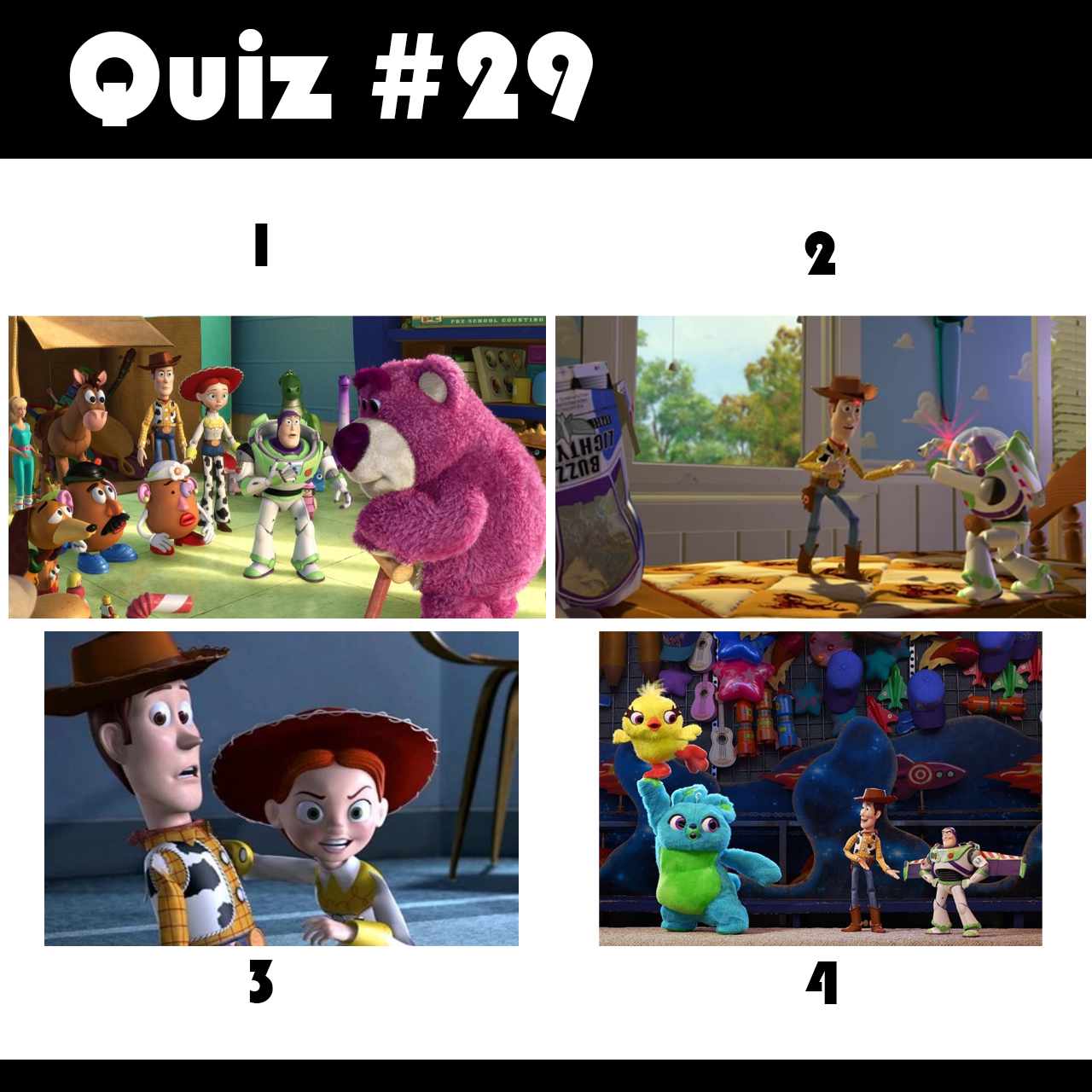 4 QuizWorld Quiz #29 1 год назад Каждый кадр из разных частей "Истории игрушек". Выберите правильную последовательность от первого м/ф до последнего 3 2 1 4 2 1 4 3 2 3 1 4 4 1 3 2 Больше квизов в канале. Переходите! Ответ: 2 3 1 4 [моё] Опрос Telegram Telegram (ссылка) Загадка Нужен совет Семья 1 1 Ещё 0