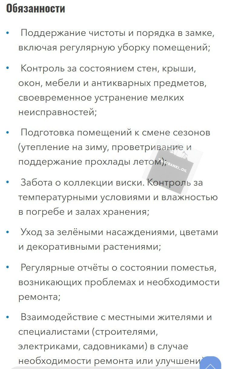 Нужно будет поддерживать чистоту в замке и внимательно следить за алкогольным хранилищем. Требования: любовь к виски и готовность проводить время без людей и шумных развлечений. Проведение дегустаций тоже входит в обязанности служащего. @banki_oil