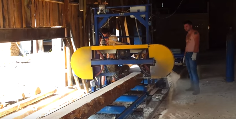 Питание идет от электродвигателя, направлено на вращение ленточной пилы на больших роликах. Видео процесса можно посмотреть тут.