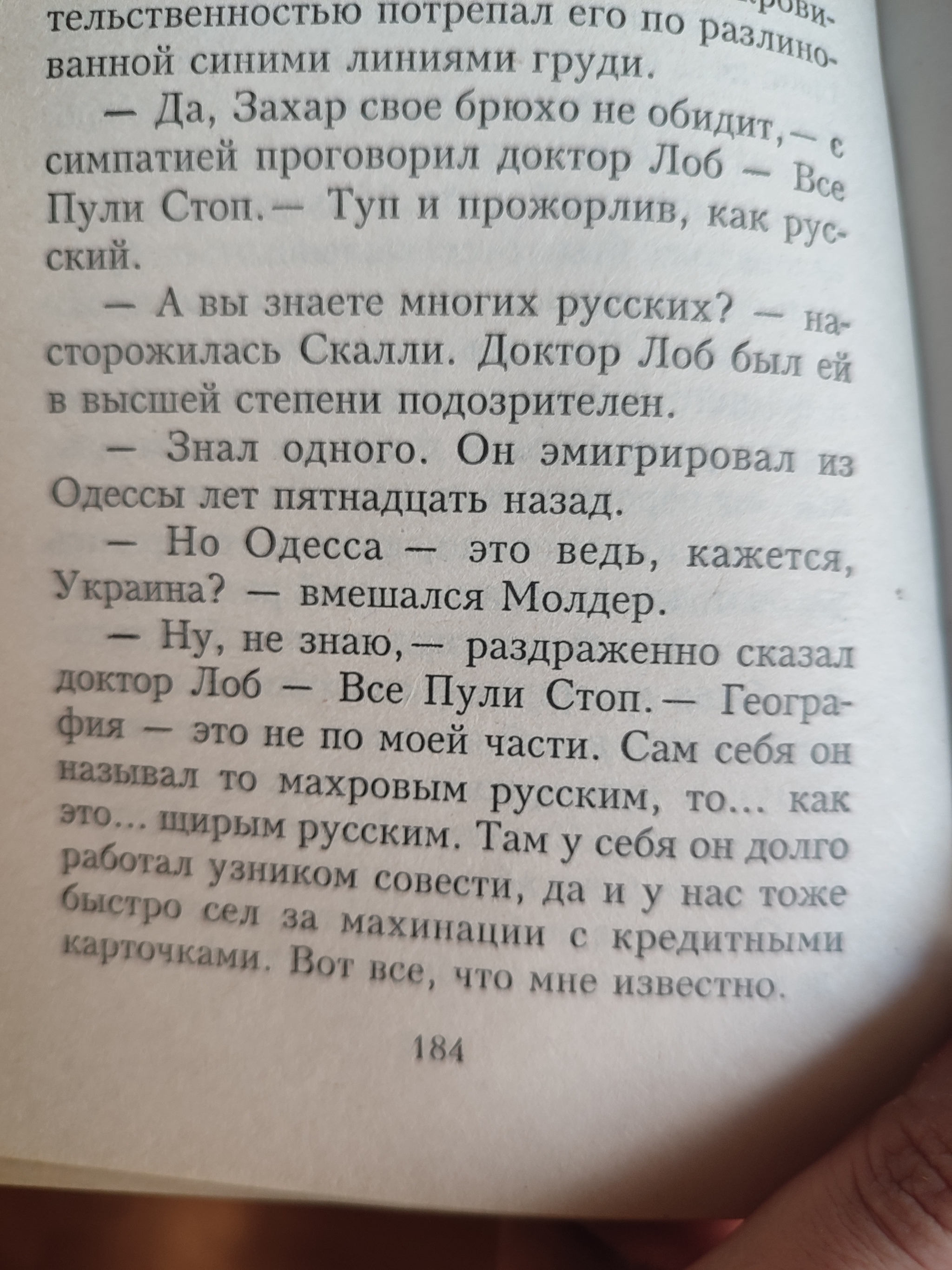Давеча решил закрыть юношеский гештальт и дочитать новеллизации "Секретных материалов", тогда некоторые из них мимо меня как-то прошли. Заказал книжки недостающие, пришла мне первая, сел читать И тут - такое! Я ржал в голосину, а это, меж прочим, издание 2001го года, задолго до, как говорится ) Тут прекрасно вообще всё, каждое предложение 😁