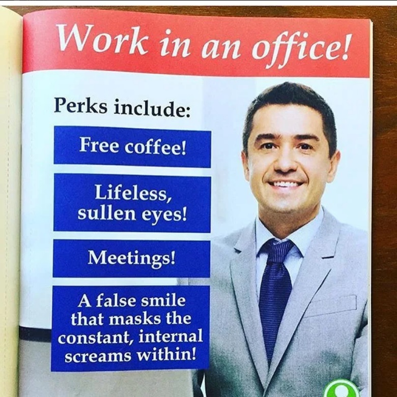 706 oragul Работайте в офисе! 6 лет назад Дополнительно:Бесплатный кофе!Безжизненные, угрюмые глаза!Встречи/Заседания/Совещания!Фальшивая улыбка которая скрывает непрекращающийся внутренний крик! Работа Офис Каторга Шахтеры Перевод 9GAG
