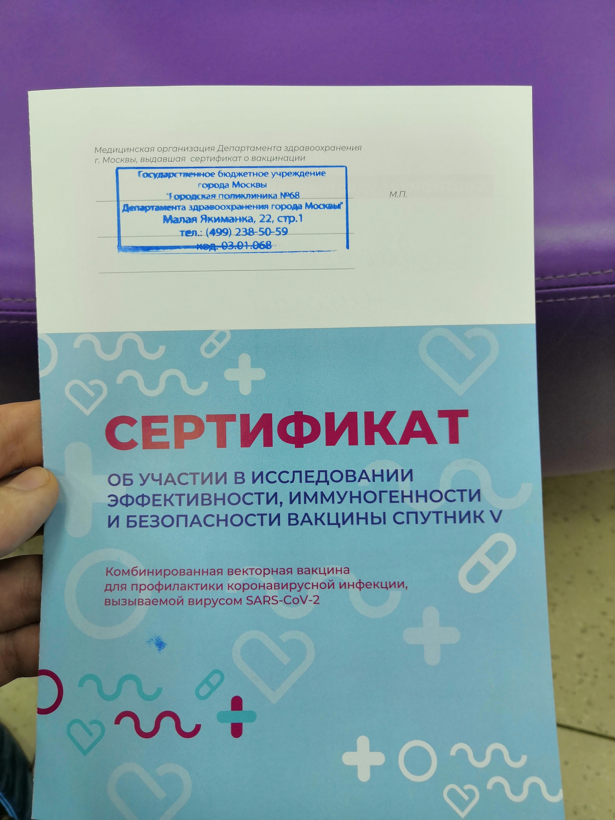 Несколько месяцев назад вписался в тестеры вакцины, прошёл отбор, укололся, словил после каждого из 2 уколов температуру примерно на сутки и всё. Сегодня выдали сертификат. Надеюсь, хорошее дело сделал.