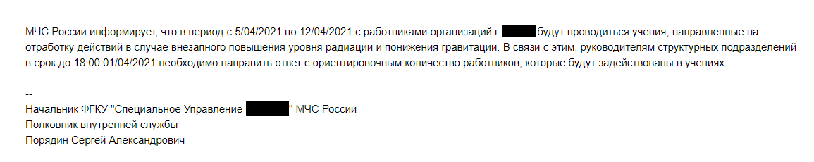 1 апреля 2021 года я как обычно решил разыграть знакомых. В этот раз выбор пал на руководителя организации, в которой работаю я, а также на руководителей подразделений Почты России. С "левого" адреса электронной почты всем было разослано письмо следующего содержания.