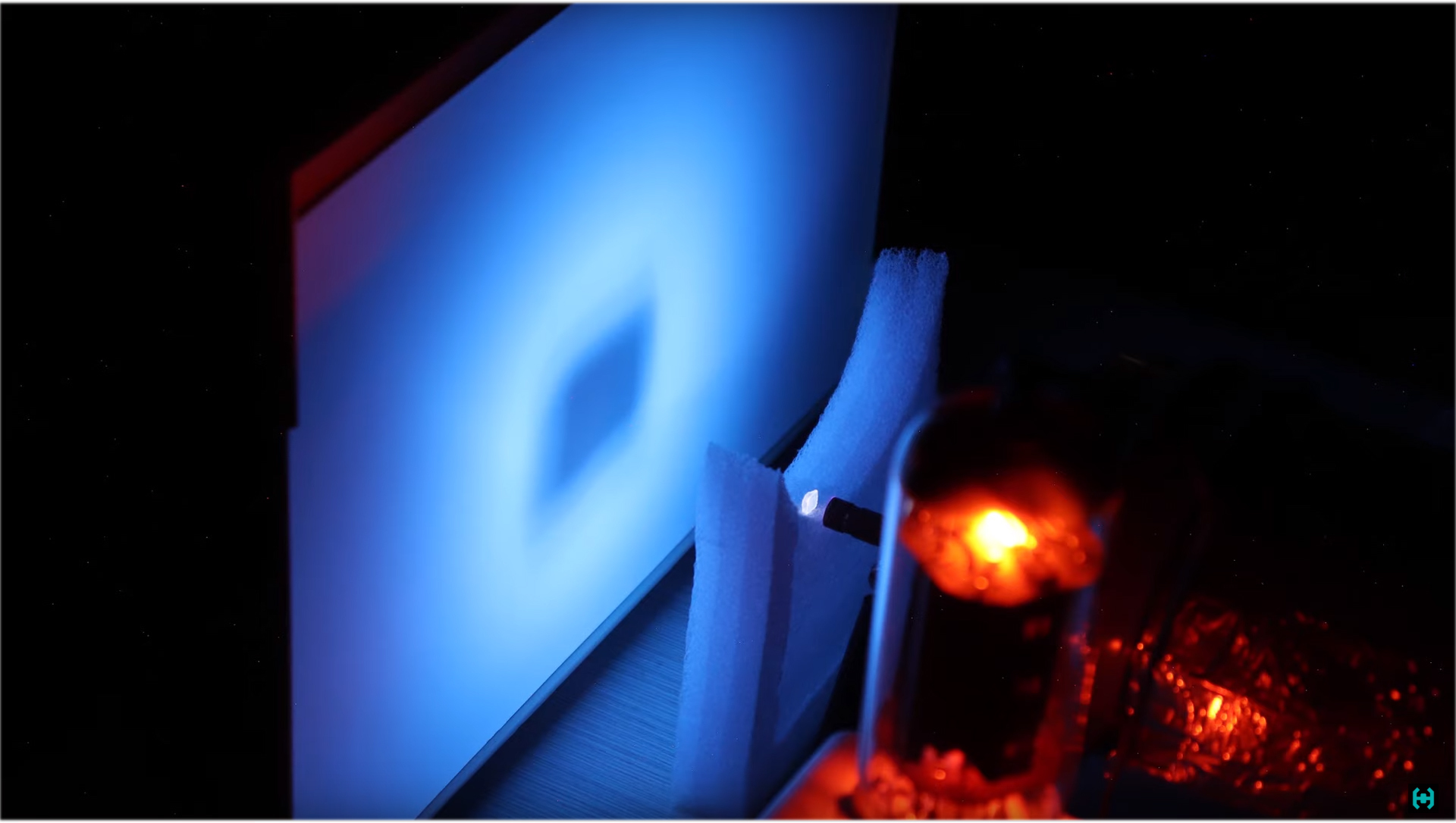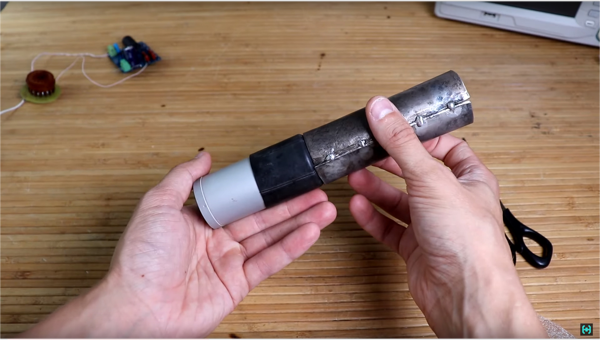 Замечательно, у нас выходит такая красивая сборка. Для защиты ФЭУ обмотаем его несколько раз тонким вспененным полиэтиленом, и наденем сверху трубку из пермаллоя — магнито мягкого материала, защищающего внутренности лампы от различных внешних электромагнитных воздействий. Как магнитное поле может влиять на электронно-лучевые трубки мы показывали в одном из предыдущих постов. Достать пермаллой можно покопавшись на барахолке, от старого осциллографа, вокруг него находится то, что мы ищем. Только есть проблема, форма тут не подходит. Необходимо поработать молотком. Нужно выровнять края, и сформировать цилиндр. Металл во время деформации образует зоны напряженности, которые необходимо отпустить с помощью нагрева материала до примерно малинового цвета.