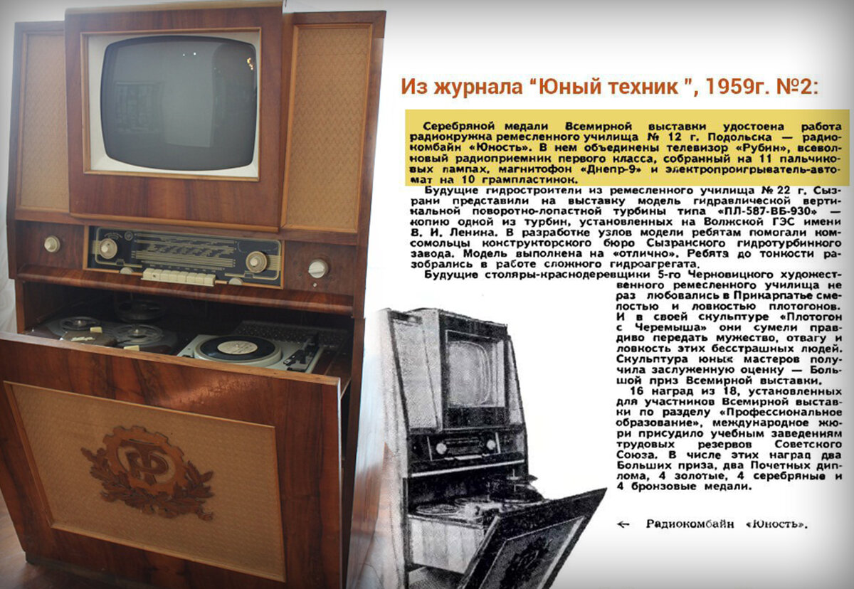 10 FRUSL Радиокомбайн «Юность». Серебряный призер Всемирной выставки в Брюсселе. 1958 г 1 год назад Серебряный призер Всемирной выставки в Брюсселе. 1958 г. Изготовлен коллективом профессионального училища № 12 г. Подольска под руководством мастера п/о В.Н. Брожека. Юный техник Радиокружок Юность Сделано в СССР 50-е 2 1 Ещё 0