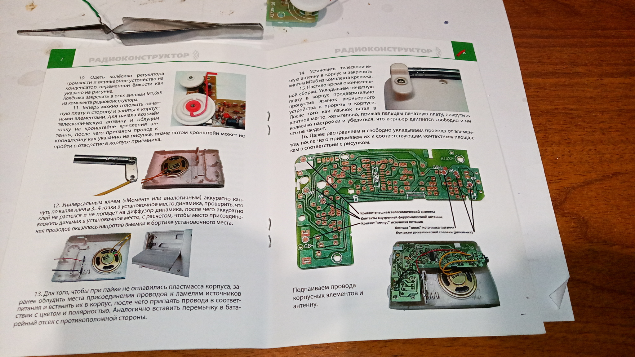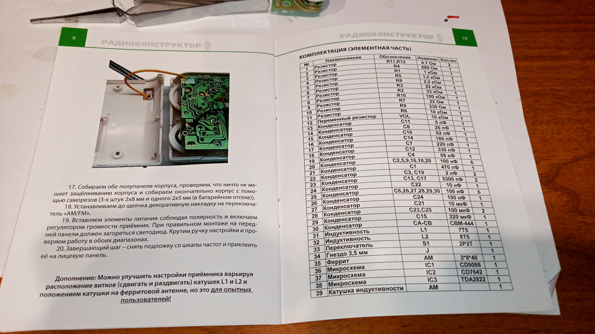 Есть набор для сборки радио. У меня уже был пост о нём. Так вот, собрал его, а он падла не фурычит! То ли я его хуевасто собрал, то ли брак.В одном месте сопротивление уходит за 2000 кОм. Фото инструкции, платы, и доступных инструментов прилагаются.Просьба сильно не минусить и не ругать за качество пайки,так как только учусь.