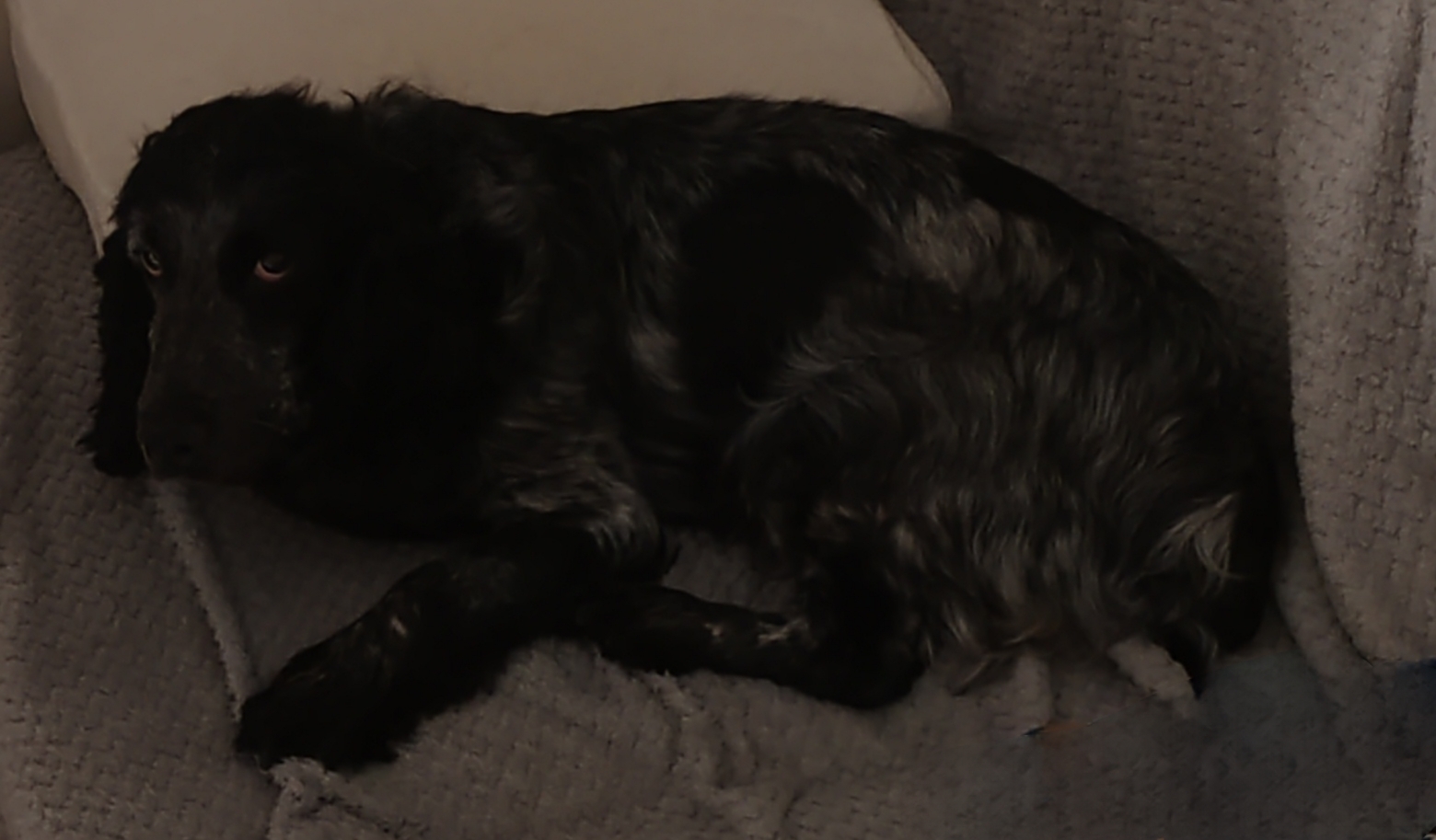 Ранее утро, собачка немного в шоке, что не работать идти, а на диване можно лежать.)))