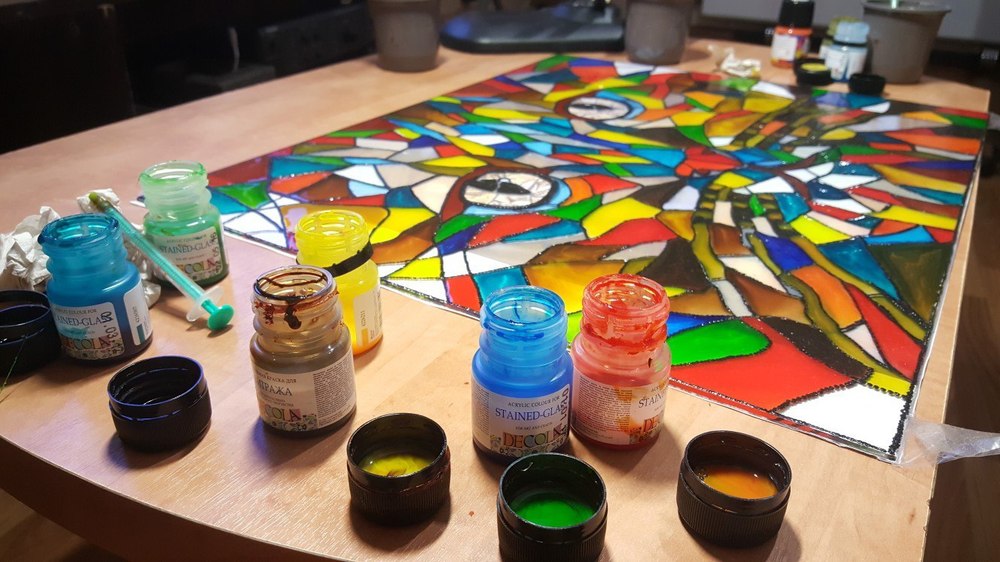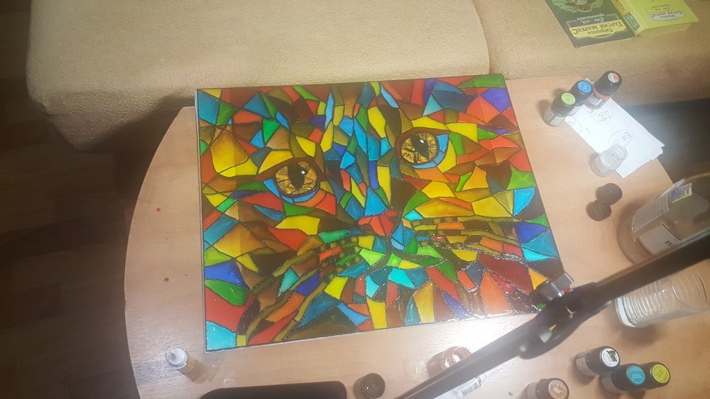Помню мы детям покупали наборы для разукрашивания застывающая краска в тюбиках. Самый легкий вариант для тех, у кого есть желание сотворить что-то похожее, но пока нет опыта. Интересных схемок много в интернете. Вот думаю может купить себе краски попробовать нарисовать подобного котика: