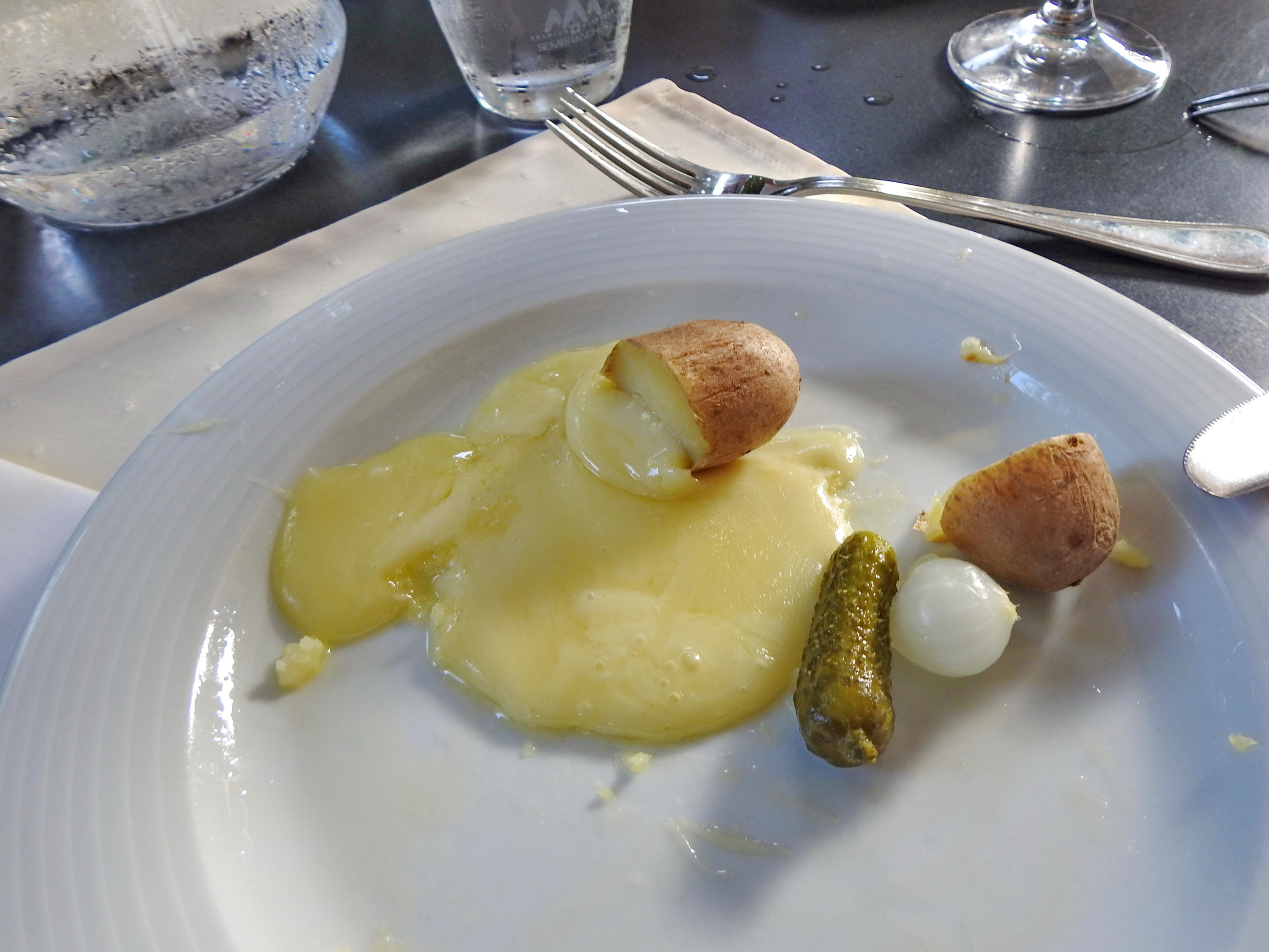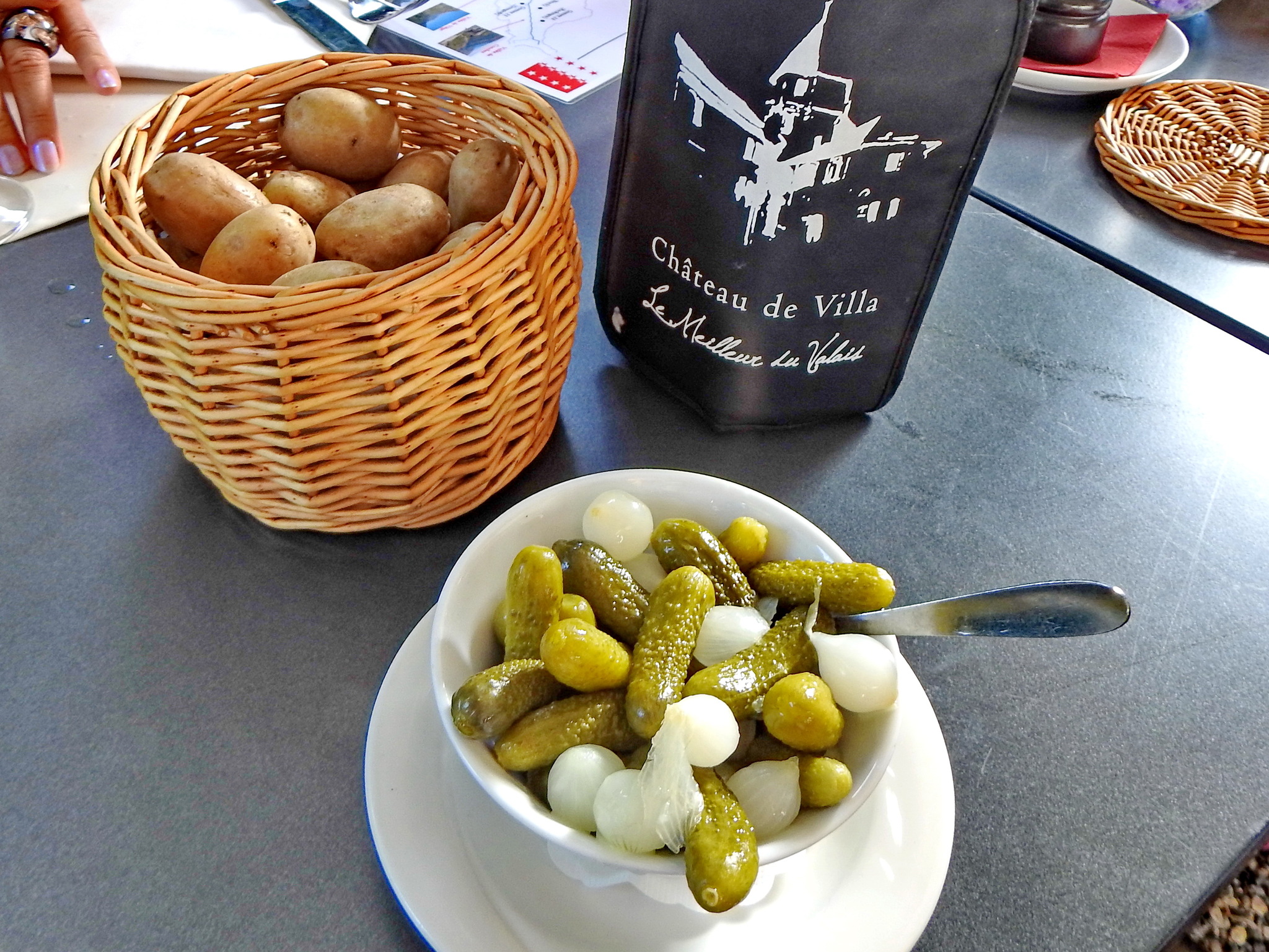 Классический раклет подается с тремя гарнирами: картофелем, маринованным луком и корнишонами .