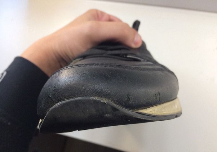 На фото выше - результат того, что кроссовки задели пластиковой тележкой (в которой место для ребенка предусмотрено) в магазине.