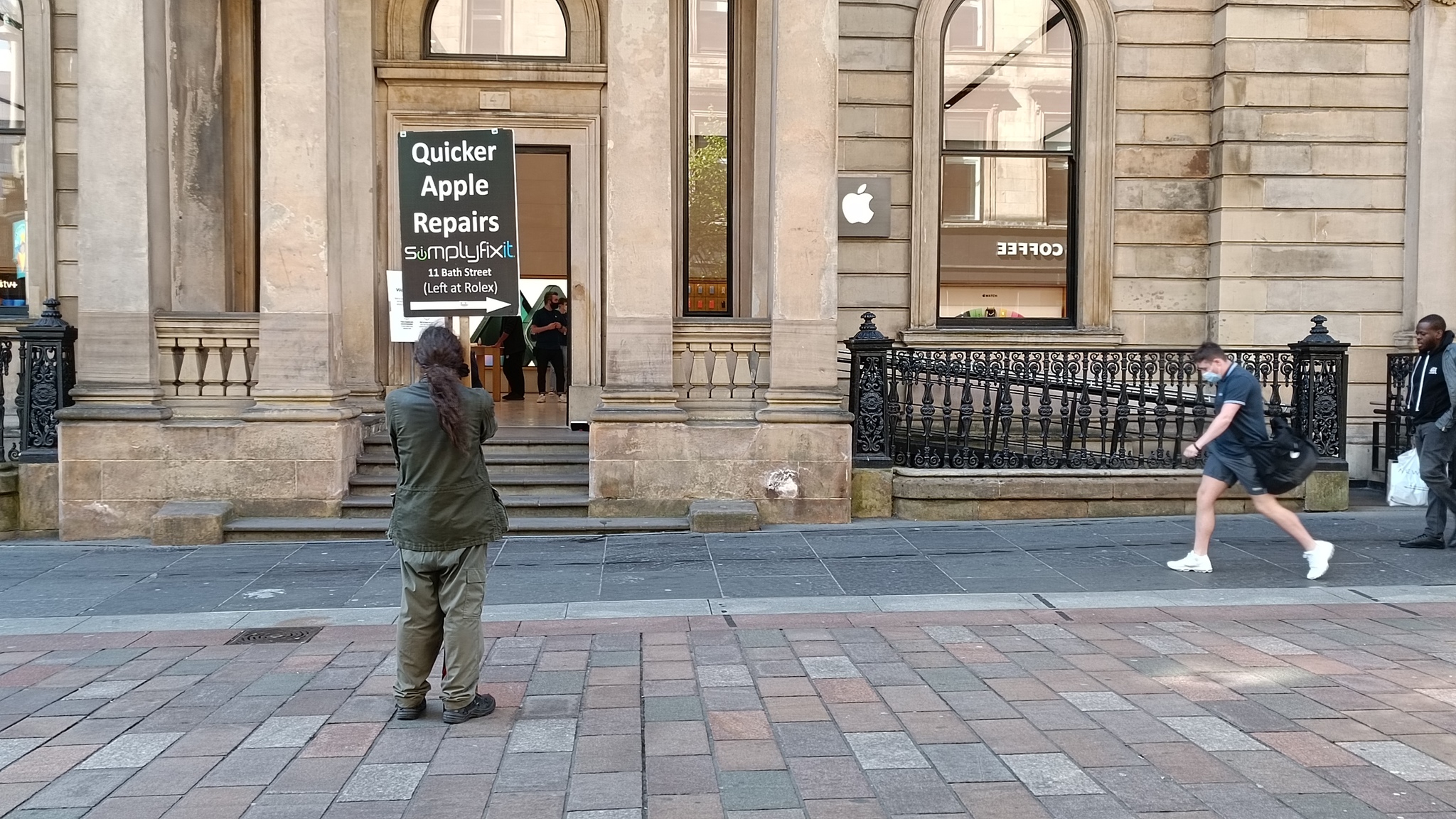 В конце покажу пример агрессивной рекламы в Глазго. Парень перед магазином Apple стоит с плакатом "более быстрый ремонт Apple" и стрелочкой в нужном направлении (и адресом, как раз слева от магазина часов Ролекс).