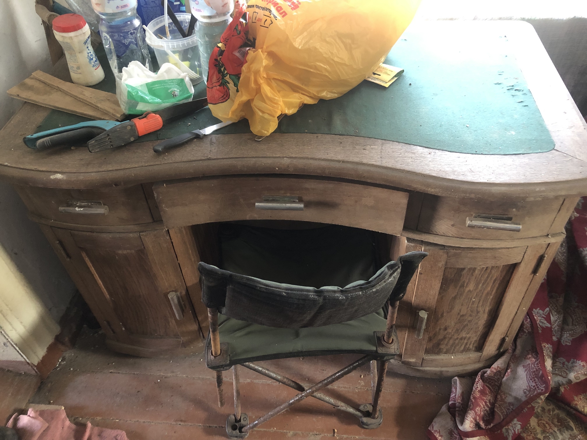 Поехал в эти выходные к знакомым на дачу. Там стоит покосившийся дом. Пошел в него искать топор, и наткнулся на вот такой вот стол. Хозяин сказал, что стол 1930 годов, принадлежал его деду - генералу. Я таки столы видел только в советских фильмах про НКВД и лампу. Стол не гнилой, уверен, поддается реставрации. Так же из гарнитура бы стул и шкаф (не догадался сделать фото). Стало жаль мебель. Предложил отреставрировать, но хозяин уперся, ничего не хочу, пусть так и стоит. Обидно..