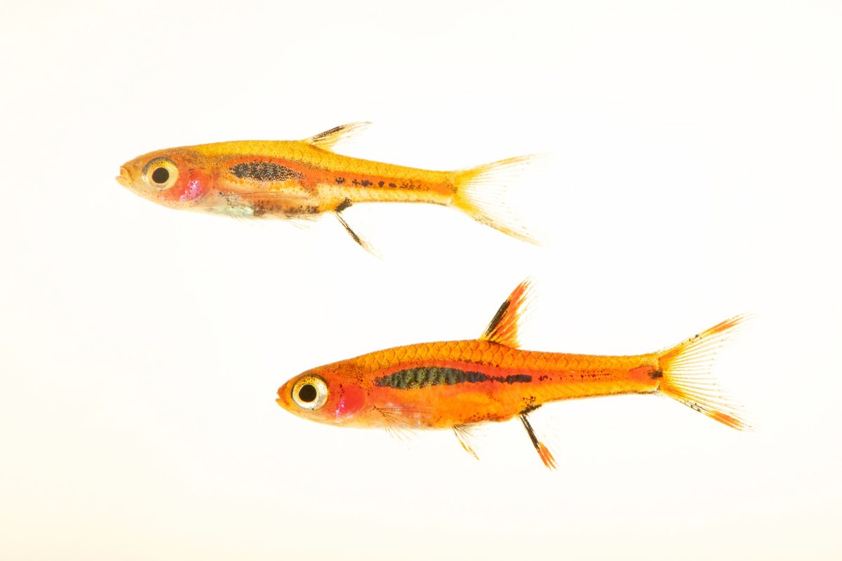 Самки заметно спокойнее во внешности: они крупнее и полнее, особенно в области брюшка, окрашены в мягкий розовато-оранжевый оттенок, а плавники у них полупрозрачные. В аквариуме именно они придают стайке гармонию, а самцы — яркость и динамику.