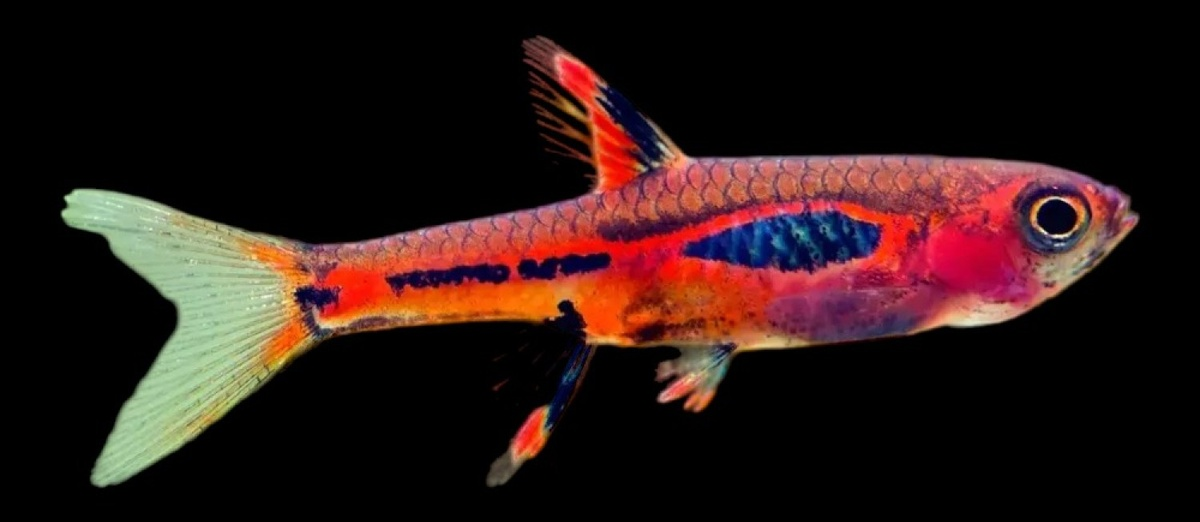 По бокам тянется тёмная, зелено-чёрная полоса, окаймлённая двумя красными линиями. На фоне красно-оранжевого тела она смотрится как настоящий ювелирный узор. А у хвоста — фирменное клиновидное чёрное пятно, из-за которого рыбку легко узнать.