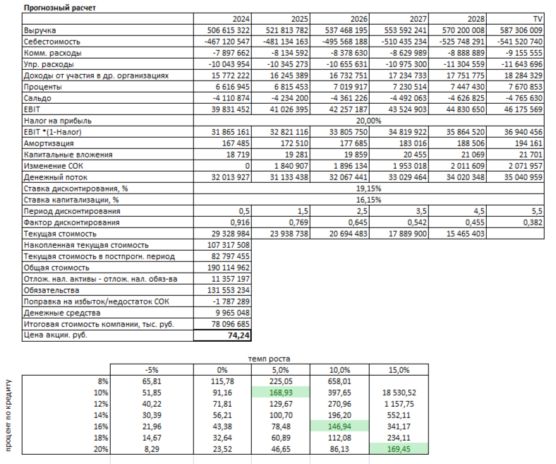 В таблице вариантов текущая рыночная цена 1 акции ближе всего соответствует параметрам: средний процент по кредитам — 16% и темп роста — 10%. Вероятность того, что ТМК сможет поддержать такой темп роста в будущем, невысока, учитывая текущие экономические условия и растущую конкуренцию на рынке трубной продукции.