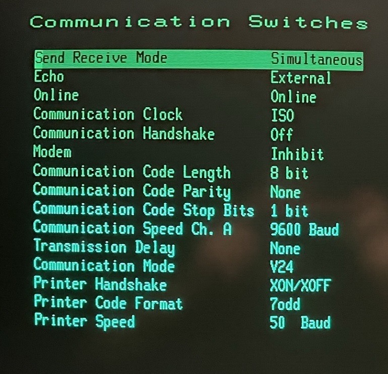 Для связи с внешним миром, был выбран COM-порт, V.24, он-же RS-232. Дефолтные настройки 8 bit, без паритета и одним стоп-битом (8N1). Настройки принтера и модема тоже присутствуют, но ввиду отсутствия этого оборудования, оставлены без изменения.
