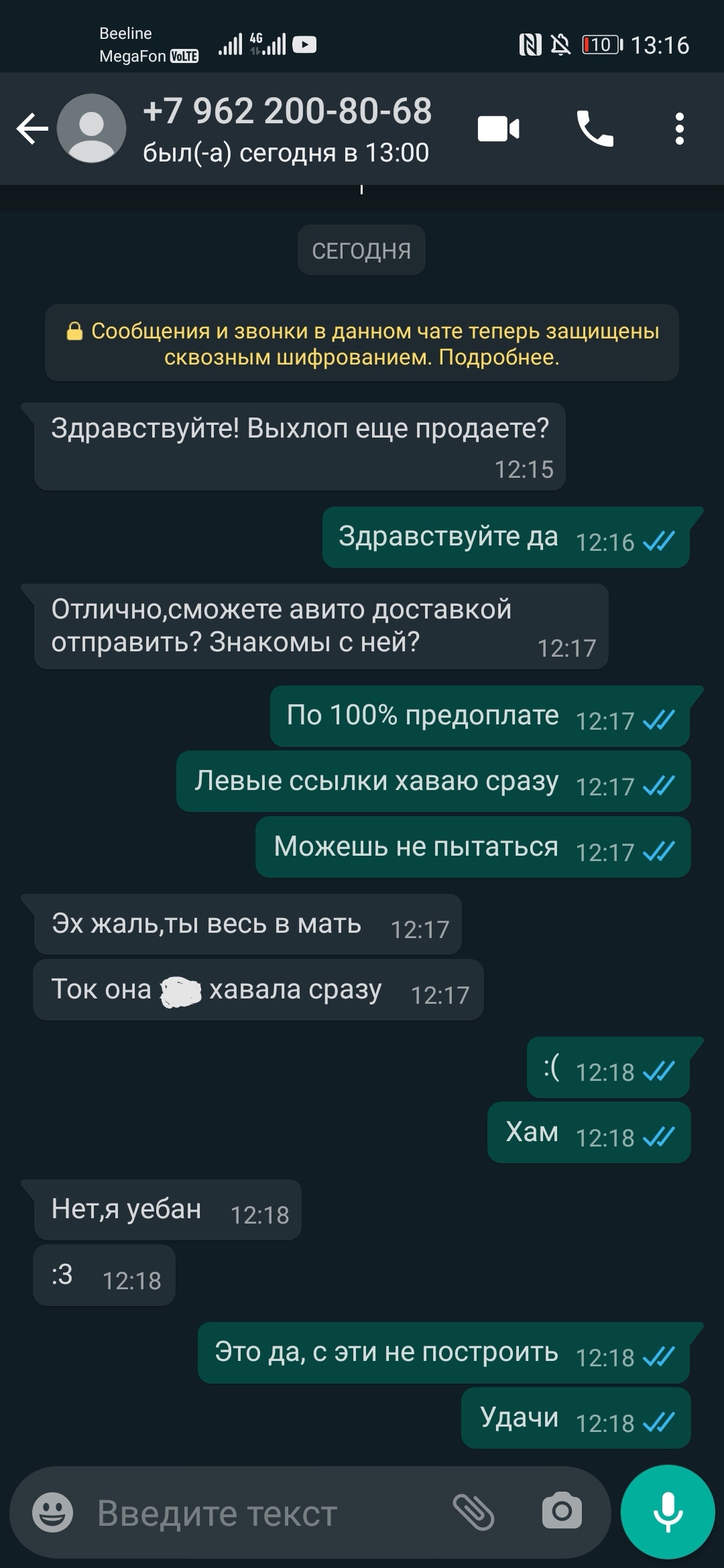Doomsquad Раскрыт секрет мошенников Авито 5 лет назад Продаю глушитель на Авито, и долго ждать не пришлось :) Оказывается вот оно что, видимо там все такие :) Правда оскорбил, но да ладно, если они "уеб@ны" то можно на это закрыть глаза :) Авито Интернет-мошенники Мат Длиннопост Переписка Скриншот Развод на деньги Ещё 0