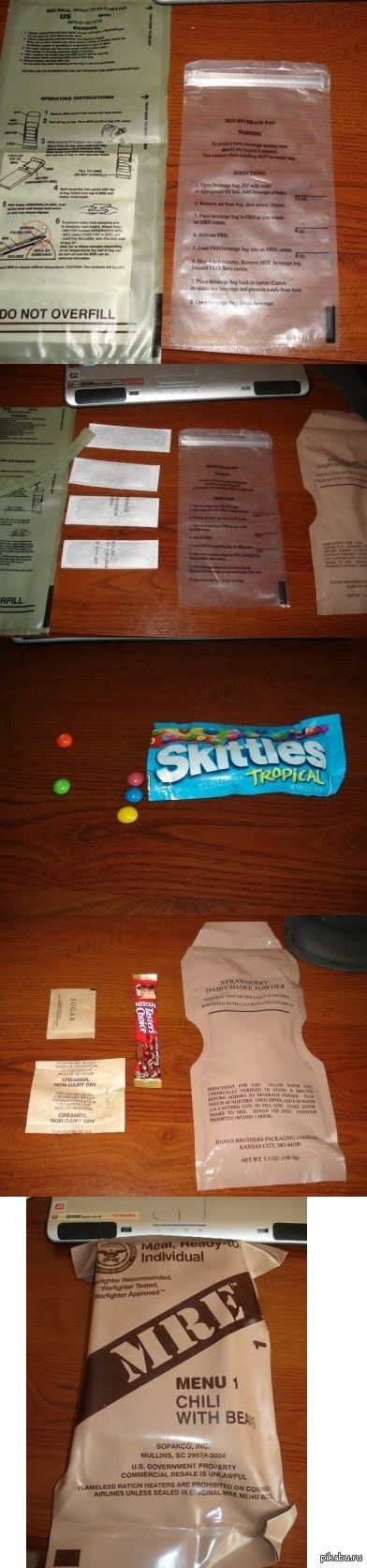 Содержимое пайка. 1. Порция 142 грамма «Кукурузы по мексикански» 2. Порция 227 грамм «Бобов в соусе чили» 3. Пакетик с плавленным сыром 42 грамма 4. Пакет с 2-мя галетами 5. Здоровый 100 гр. пакет «молочно-сливочного» растворимого напитка 6. Пакет конфет "Скитлс" 7. Запакованая пластиковая ложка Скажу пару слов о ложке. Ибо у них вроде все то же самое, что и у нас, но есть маленькие пендосовские отличия, которые и указывают, что они пендосы! Так вот мало того, что ложка была в отдельном пакете гигиенически запакована! Так она еще и оказалась неимоверно крепкой! Такой бы только нашу перловку долбать. Так же в пайке был отдельный пакетик в котором было запаковано: 8. Две жевачки 9. Небольшой рулончик сральной бумаги 10. Влажная салфетка 11. «книжка» со сспичками и с чиркалом 12. Пакет красного перца 13. Пакет соли 14. Пакет сахара 15. Пакет сухих сливок 16. Стикер кофе