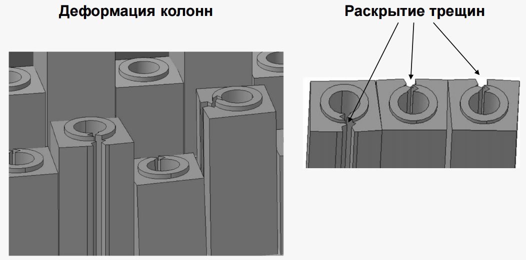 Тут мы как раз видим фото трещин в графитовых блоках РБМК. Трещины приводят к тому, что графитовый блок начинает занимать больше места в реакторе, и, соответственно, давить на соседние.