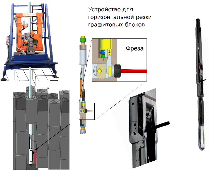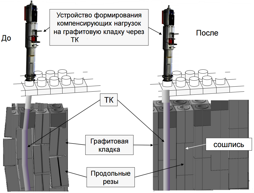 В итоге, было принято решение, которое в своё время уже отрабатывалось на наших промышленных реакторах АДЭ. Это выпрямление кладки специальными устройствами - натяжителями. Притом перед натяжением графитовые блоки распиливались, чтобы для выпрямления появлялось свободное место. Выглядело это примерно так:
