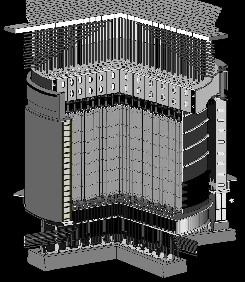 Как видно, сама активная зона состоит из множества графитовых прямоугольных колонн, которые стоят вплотную друг к другу и внутри которых находятся каналы с топливом, а также стержнями управления и защиты. Так вот, вторичное распухание графита начало приводить к тому, что графитовые блоки стали постепенно повреждаться.