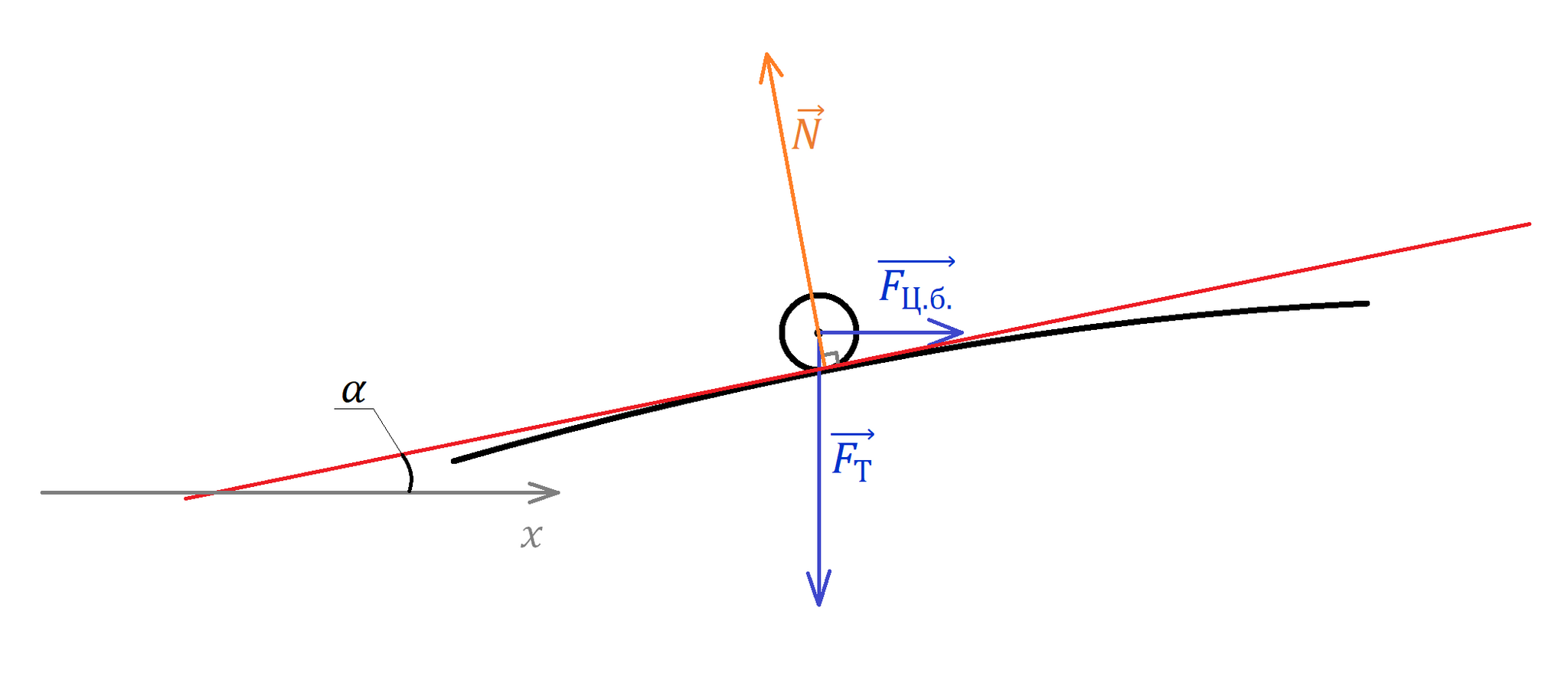 Так как воронка мысленная, то забываем про школьную g = 10 м/с^2 и записываем g = 1. Также здесь у нас затесался тангенс, однако из рисунка с силами мы помним, что угол тут - угол наклона касательной к горизонту. А значит сам тангенс равен производной искомой функции:
