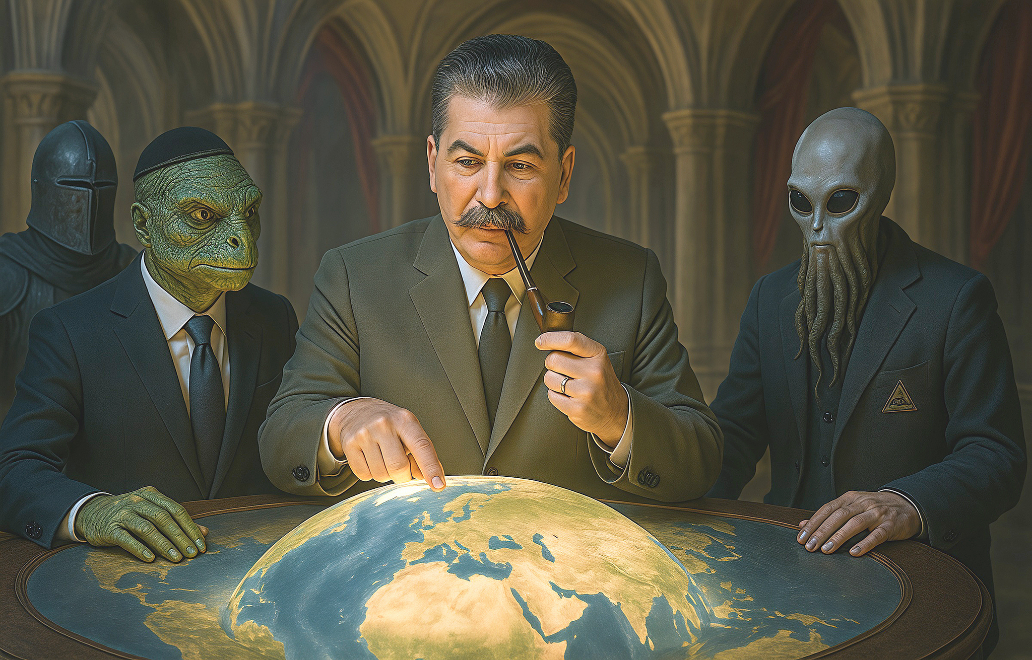 yarbush 6 месяцев назад Рассекречены шокирующие архивы А вот реконструкция архивного фото из газеты: Товарищ Сталин показывает делегатам пришельцев и рептилоидов маршрут героического дрейфа научной экспедиции Папанина на льдине в 1937 году. [моё] Сталин История России Арты нейросетей Ещё 0