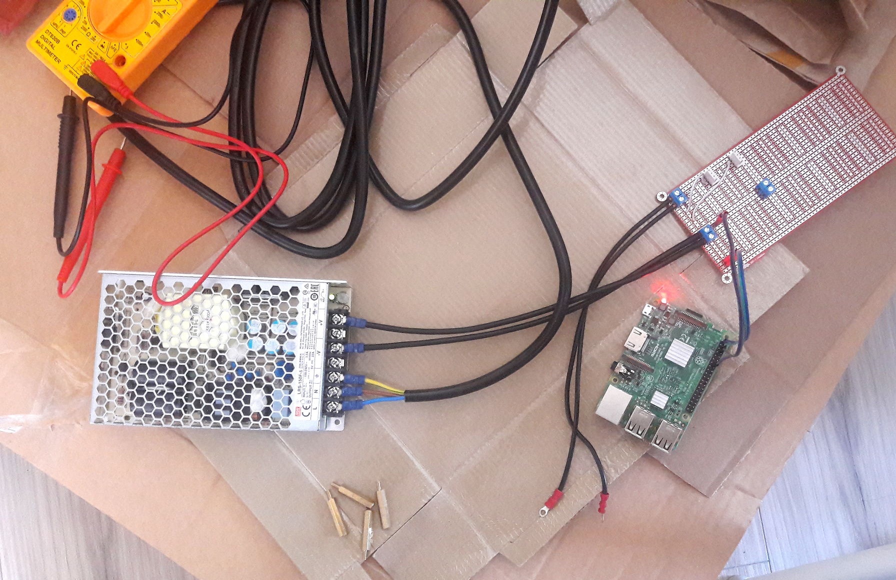 Пока ещё не решил. Думаю, что либо какой-нибудь компьютерный, либо самому что-нибудь сделать. Проводов на фотографиях много, но это: провода к двум блокам питания, от БП к клеммникам на макетной плате и от макетной платы к RPi - 2 провода на контакты 5V и 2 провода - землю.