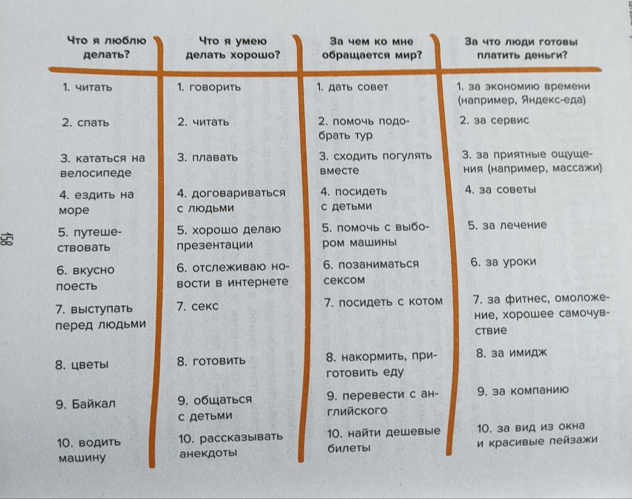 Что с этим делать? Татьяна в своей книге «Мне все льзя» приводит упражнение, которое мне сначала показалось банальным и набившим оскомину. Там надо в четыре столбца написать ответы на вопросы: Что я люблю делать, Что я умею делать хорошо, За чем ко мне обращается мир, За что люди готовы платить деньги.