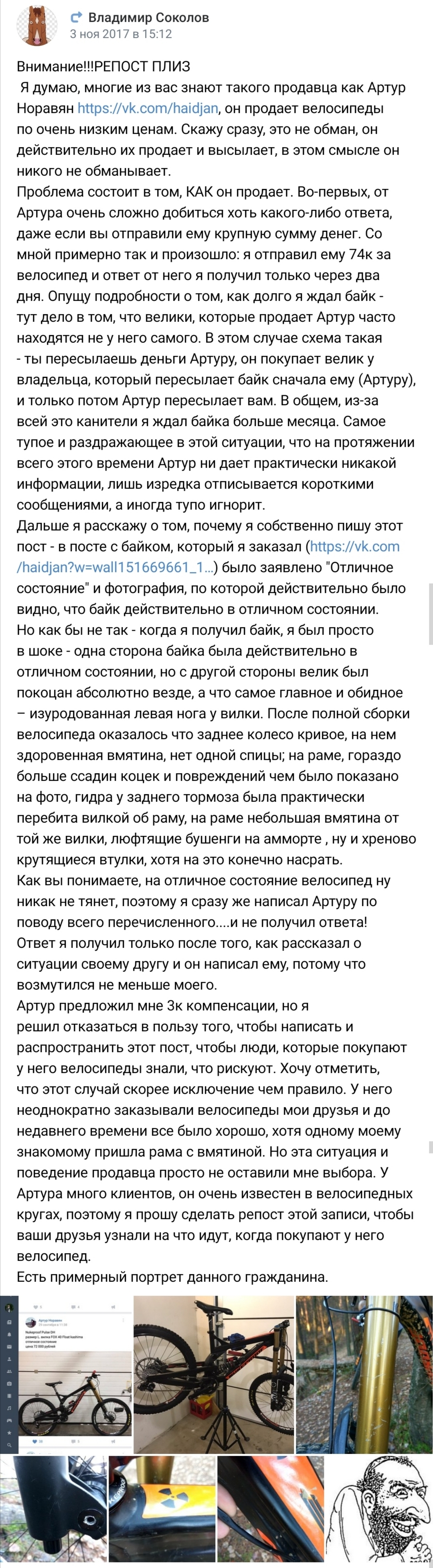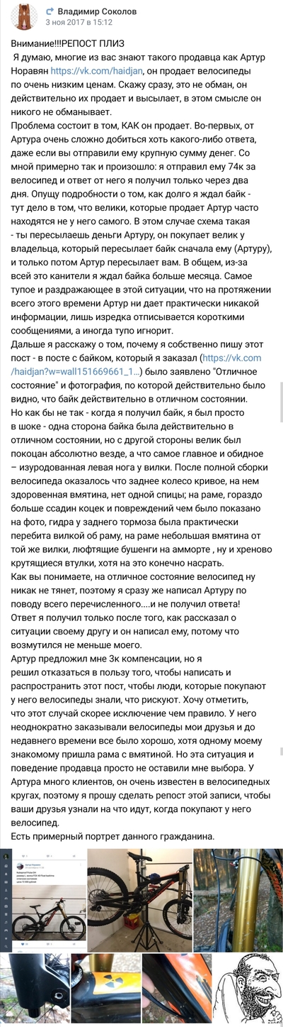 Через какое-то время и Артур Норавян разместил объявление о продаже такого-же велосипеда.